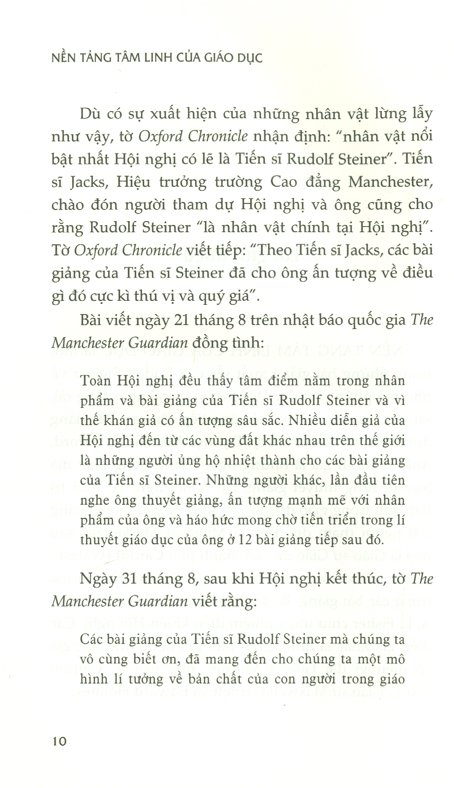 - Tác phẩm Nền tảng tâm linh của giáo dục là một trong những bài giảng xuất sắc của Rudolf Steiner về phương pháp giáo dục Waldorf vì có cái nhìn rộng rãi, sâu sắc, táo bạo và có khả năng tiếp cận cao. Bài giảng được đưa ra năm 1922 tại Đại học Mansfield, Oxford, Anh và thính giả là những người danh tiếng nhất mà Steiner từng thuyết giảng. Đó là hội nghị về “Giá trị tâm linh trong giáo dục và đời sống xã hội” với khoảng 200 người tham dự. Tiến sĩ Millicent Mackenzie, sau này là Giáo sư Giáo dục tại thành phố Cardiff (Wales) - người mà Steiner rất kính trọng - giữ vai trò chủ tọa trong các bài giảng. Bộ trưởng Bộ Lao động, Tiến sĩ H. A. L. Fisher chịu trách nhiệm điều khiển Hội nghị. Các diễn giả khác là những tên tuổi nổi tiếng như học giả cổ điển vĩ đại Gilbert Murray, nhà văn A. Clutton Brock, Giáo sư Maxwell Garnett và Edward Holmes. “Giáo viên cần có tâm trí cởi mở, sẵn sàng đón nhận kiến thức mới mỗi ngày và khuynh hướng có thể biến đổi tri thức tích lũy thành tiềm lực giúp tâm trí luôn rộng mở đón nhận cái mới. Điều này giúp con người khỏe mạnh, trẻ trung và năng động. Một trái tim cởi mở đón nhận những thay đổi trong cuộc sống - sự mới mẻ bất ngờ và tiếp diễn của cuộc sống - phải là bản chất và tâm tính cơ bản của một giáo viên trường Waldorf”.