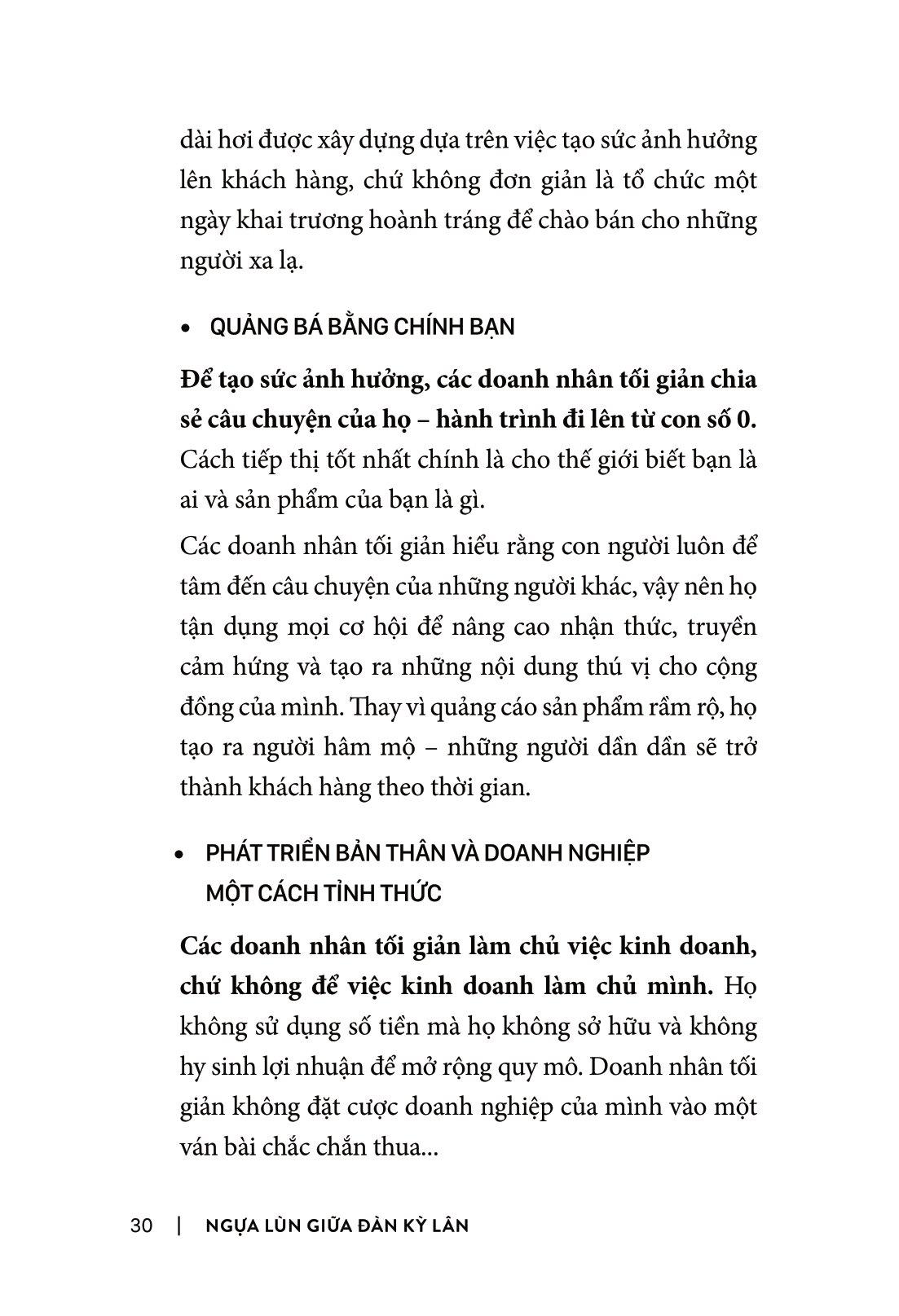 Nhiều nhà kinh doanh và những người đang có ý định khởi nghiệp cũng đã trải qua quá trình tự hỏi bản thân rất nhiều và kết quả là đi đến cùng một kết luận. Bạn sẽ bắt gặp nhiều câu chuyện của họ trong cuốn sách Ngựa Lùn Giữa Đàn Kỳ Lân. Trong sách, họ được gọi là những “doanh nhân tối giản” và gọi công ty của họ là “doanh nghiệp tối giản”.