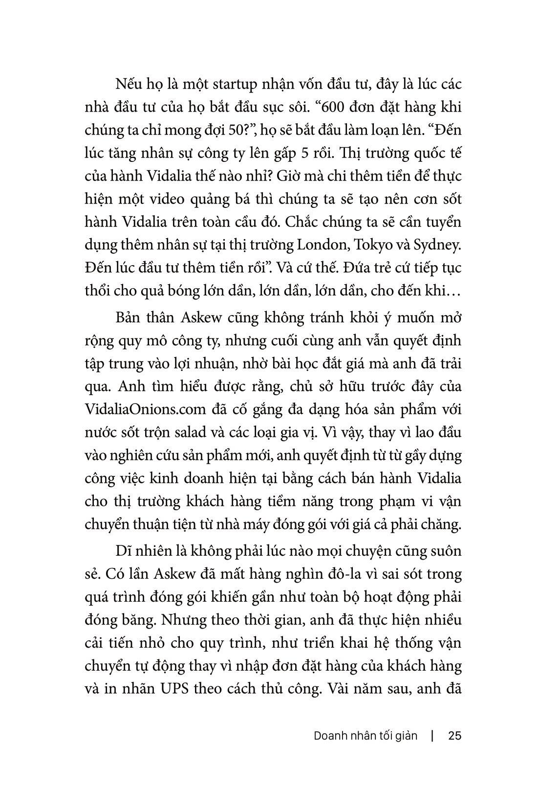Thế nên với họ, một doanh nghiệp thu về lợi nhuận và phát triển ổn định không được coi là một doanh nghiệp thành công. Qua trải nghiệm của tác giả Sahil Lavingia ở cả Thung lũng Silicon lẫn ở những khu vực ít ồn ào hơn, tác giả đã có cái nhìn ở cả hai môi trường và từ đó đặt ra khái niệm "doanh nhân tối giản".