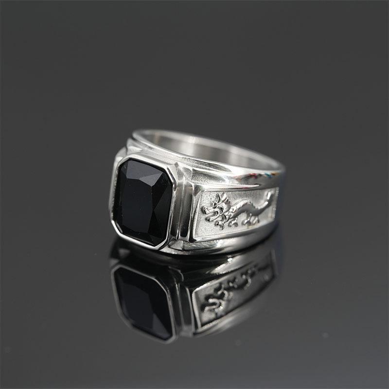 Nhẫn nam titan cao cấp thời trang kiểu chạm rồng 2 bên trangsucpt đá đen nhẫn màu trắng thép không gỉ PTNNA251