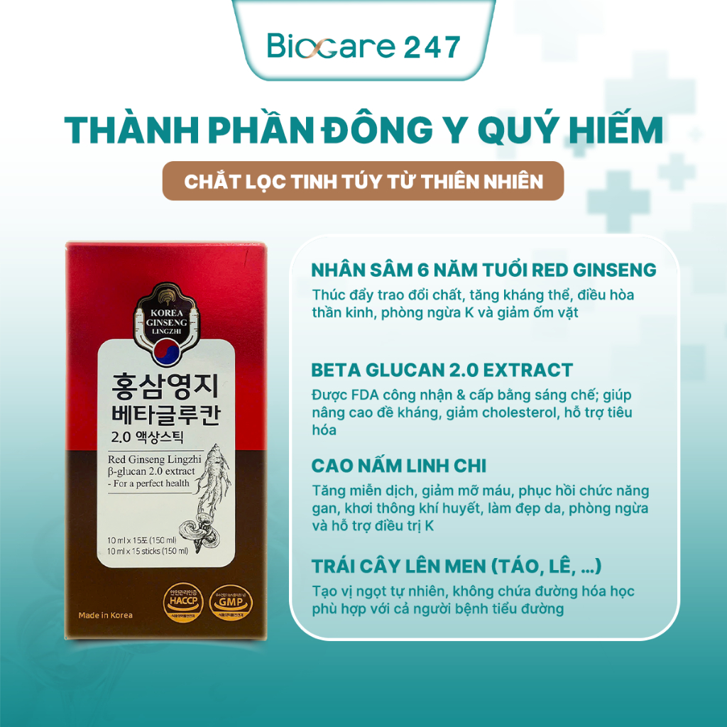 Sản phẩm Nhân sâm linh chi Beta Glucan 2.0 extract là phiên bản nâng cấp hoàn hảo so với Nhân sâm linh chi Beta Glucan 1.6. Sản phẩm được chiết xuất từ Nhân Sâm 6 năm tuổi Red Ginseng cô đặc (hàm lượng dinh dưỡng cao), Cao Nấm Linh Chi, hoạt chất Beta Glucan 2.0, nấm Agaricus, nấm reishi, nấm chaga, táo tàu, vitamin C, vitamin D… và bào chế dưới dạng extract, giúp mang lại hiệu quả cao và an toàn gấp nhiều lần so với các sản phẩm nhân sâm thông thường khác. Nhân sâm linh chi Beta Glucan 2.0 Extracr với thành phần Nhân sâm 6 năm tuổi Red Ginseng và nấm linh chi, đây được mệnh danh là thần dược trong Đông y của Hàn Quốc, được người dân Hàn Quốc sử dụng hàng ngày như là 1 loại thực phẩm bổ sung cho sức khỏe. Sản phẩm đặc biệt phù hợp với người cao tuổi, hay mệt mỏi, người mới ốm dậy, suy nhược cơ thể,… Trong những năm trở lại đây, Nhân sâm linh chi Beta Glucan dần trở thành món quà sức khỏe được ưu tiên lựa chọn để tặng cho người thân và đối tác quan trọng. Nhân sâm linh chi Beta Glucan 2.0 Extract – Chắc lọc tinh túy từ thiên nhiên.  Thành phần nguyên liệu chính của sản phẩm đã tạo nên sự khác biệt và mang lại giá trị tuyệt vời cho sức khỏe. Sản phẩm sở hữu những yếu tố quý giá giúp hỗ trợ và củng cố hệ miễn dịch cho cơ thể  – Nâng cao hiệu quả và an toàn gấp nhiều so với sản phẩm thông thường.    Nhân sâm 6 năm tuổi Red Ginseng Nhân sâm 6 năm tuổi Red Ginseng được nghiên cứu và chứng minh chứa rất nhiều dưỡng chất tối ưu cho cơ thể con người. Được thu hoạch vào độ tuổi vàng của sâm giúp sâm đạt được nguồn dinh dưỡng cao nhất với lượng lớn hoạt chất quý giá cùng các dưỡng chất thiết yếu, mang đến những lợi ích tối đa cho sức khỏe. Đặc biệt, nhân sâm 6 năm tuổi Red Ginseng được chiết xuất từ thân và hoa có hàm lượng saponin cao gấp nhiều so với nhân sâm thông thường, nổi bật với những công dụng tuyệt vời như: ? Tác động trực tiếp đến hệ thống miễn dịch ? Hỗ trợ tăng cường kháng thể và kháng vi khuẩn ? Giảm stress, điều hòa hệ thần kinh trung ương ? Tăng cường trao đổi chất, điều hòa cơ ? Hạn chế tổn thương chức năng gan, bảo vệ gan, ức chế sự kết dính của các tiểu huyết cầu ? Ngăn chặn sự phát triển của tế bào ung thư Nấm linh chi Chứa Polysaccharides giúp tăng cường hệ miễn dịch, cải thiện và phục hồi chức năng gan, hạn chế sự phát triển của tế bào ung thư, Adenosine giảm cholesterol và mỡ trong máu, cân bằng trao đổi chất, cải thiện chức năng tiêu hóa, ức chế các triệu chứng dị ứng, lưu thông khí huyết và giúp các tế bào hấp thụ oxy tốt hơn, kháng viêm, chống dị ứng và làm đẹp da. Beta Glucan 2.0 Extract Với sự nâng cấp từ 1.6 lên 2.0, Hoạt chất Beta Glucan có trong sản phẩm này cao hơn các loại men thông thường. Đây là chuỗi phân tử Polymer polysaccharide, là chất xơ hòa tan được enzym hóa từ chủng khuẩn Saccharomyces cerevisiae, chứa 50% protein thực vật, giàu chất khoáng và các vitamin cần thiết cho cơ thể, tác dụng mạnh lên hệ miễn dịch, ngăn ngừa ung thư, nâng cao sức đề kháng, giảm cholesterol, kích hoạt chức năng tiêu hóa, cân bằng hệ men đường ruột, Được FDA công nhận là phụ gia thực phẩm và cấp bằng sáng chế quốc tế: