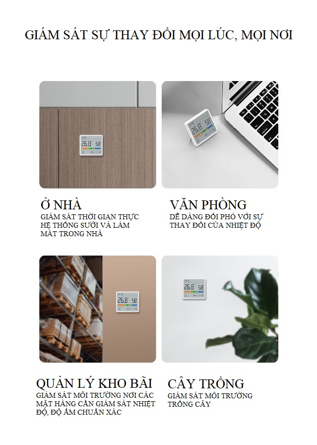 - Nhạy cảm, giám sát chính xác Tích hợp cảm biến độ nhạy cao, làm mới trong vài giây, thiết kế nạp khí ở mặt sau, cảm giác chính xác những thay đổi về nhiệt độ, độ ẩm