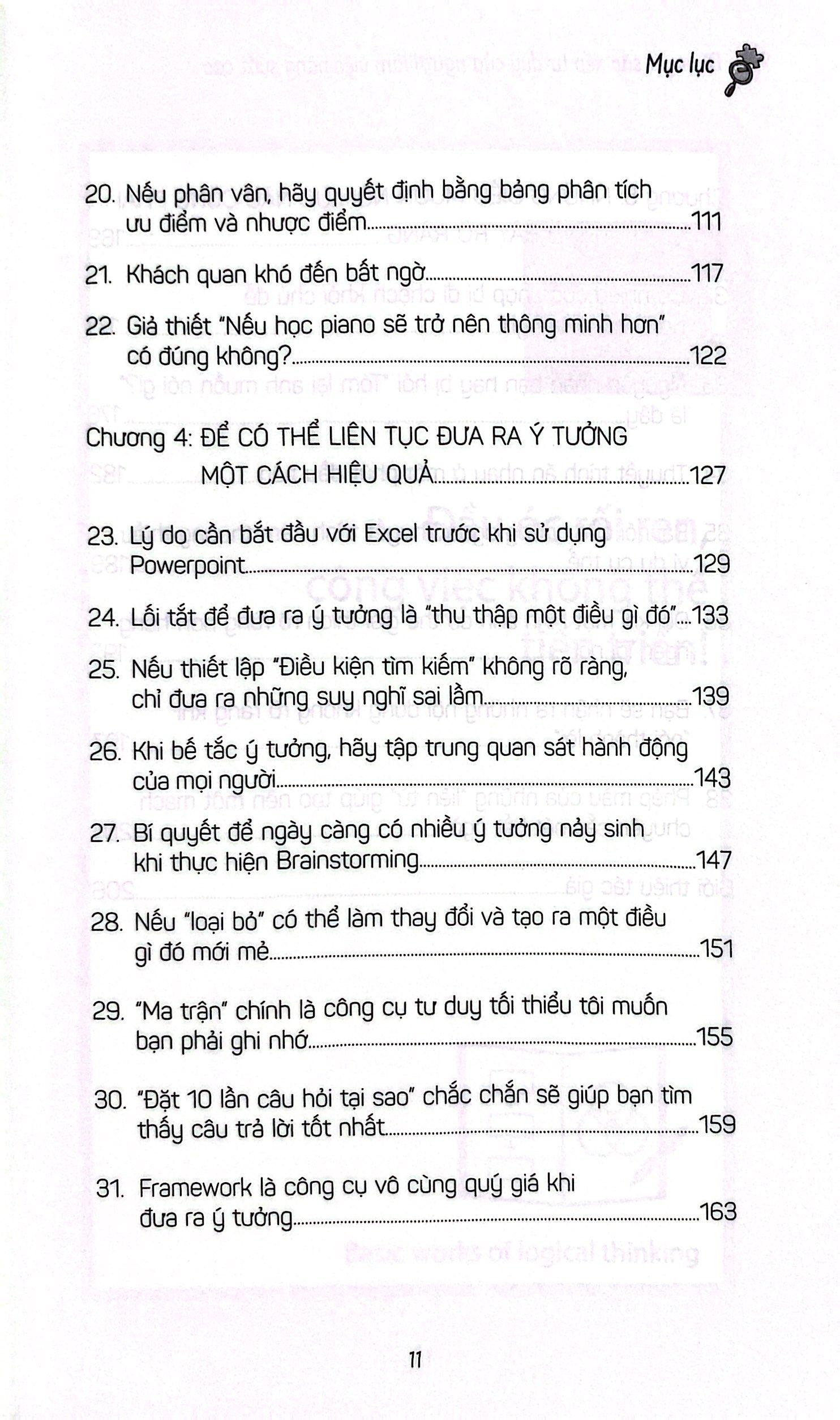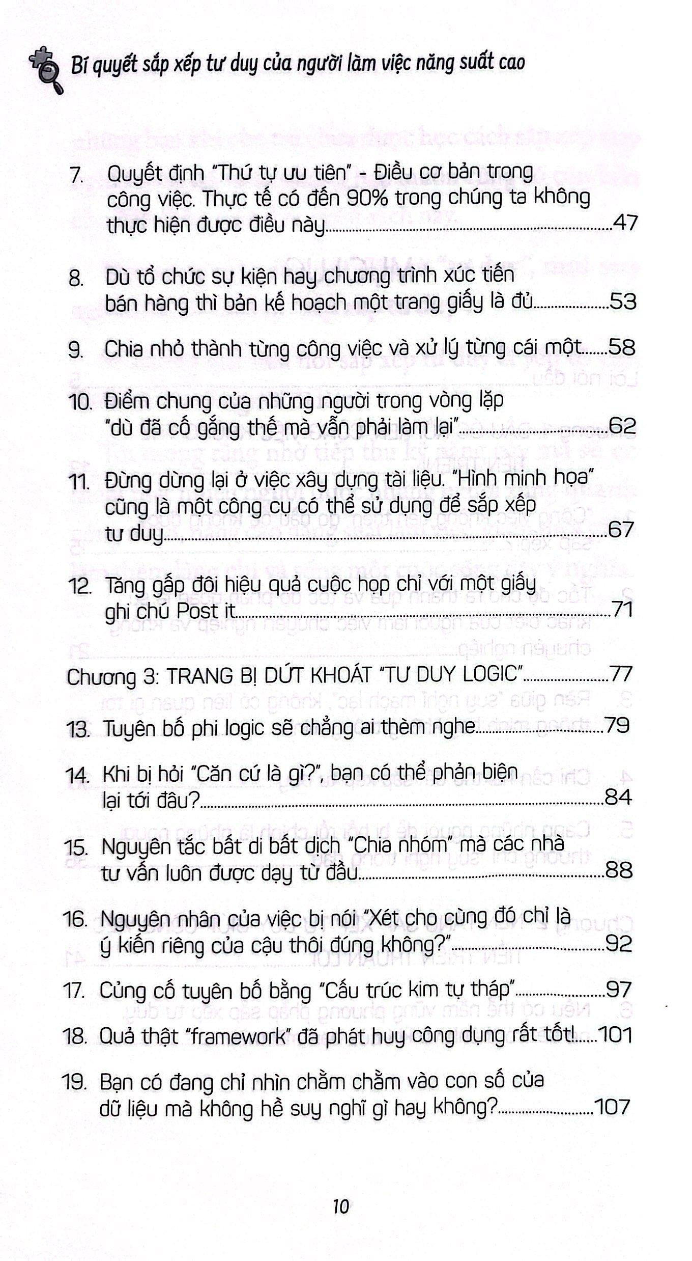 Bằng việc trang bị cho m.ình kiến thức và kinh nghiệm sắp xếp tư duy, chúng ta có thể cắt giảm thời gian "đầu óc bị rối ren", nhờ đó tăng hiệu suất làm việc. Kết quả của việc rèn luyện cho m.ình "phương pháp sắp xếp đầu óc" sẽ giúp số lượng công việc phải làm đi làm lại giảm dần, đánh giá của công ty đối với bản thân cũng được tăng lên. Từ đó giúp bạn không còn phải quẩn quanh phải làm thêm "lãng phí", có thời gian dành cho bản thân nhiều hơn với các thú vui, cho cuộc sống riêng tư, và hài lòng với công việc, cuộc sống của m.ình.