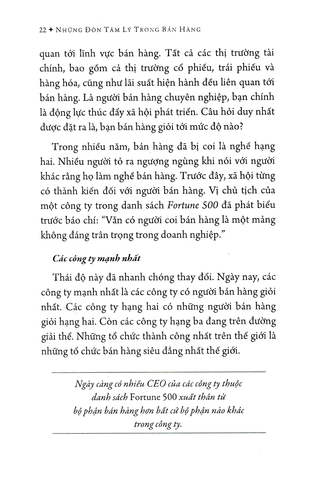Những Đòn Tâm Lý Trong Bán Hàng (Psychology Of Selling) chính là nghệ thuật bán hàng mà Brian Tracy, một doanh nhân thành đạt, đúc rút từ chính câu chuyện khởi nghiệp của cuộc đời ông. Trong bán hàng, bạn chỉ cần giỏi hơn và khác biệt chút đỉnh trong mỗi công đoạn để tích lũy và dần tạo nên một khác biệt lớn về thu nhập. Nếu bạn là người bán hàng mà lại sợ bị từ chối, bạn đã chọn sai cách kiếm sống. Khách hàng không quan tâm sản phẩm của bạn là gì. Họ chỉ quan tâm sản phẩm hay dịch vụ của bạn có ích gì cho họ. Bí quyết của thành công trong kinh doanh dành cho bạn là hãy bắt đầu sớm hơn một chút, làm việc chăm chỉ hơn một chút và ở lại lâu hơn một chút. Đọc Những Đòn Tâm Lý Trong Bán Hàng (Psychology Of Selling, bạn sẽ biết đến khái niệm "khả năng thành công" - một trong những ý tưởng quan trọng nhất về bán hàng và quản lý thế kỷ 21, biết đến khái niệm "cây anh đào nở hoa", hoặc bạn cần sử dụng kinh nghiệm, kỹ năng sáng tạo nào để bạn trở thành người bán hàng chuyên nghiệp và khách hàng cũng thành người mua chuyên nghiệp. Những Đòn Tâm Lý Trong Bán Hàng khuyên bạn: Hãy tự đặt mình vào vị trí của người mua, bạn sẽ bán được hàng. Nếu bây giờ bạn không, hoặc không dự định kinh doanh, bạn cũng hãy tin rằng kiến thức kinh doanh bằng tâm lý mang đến cho bạn không hề vô ích