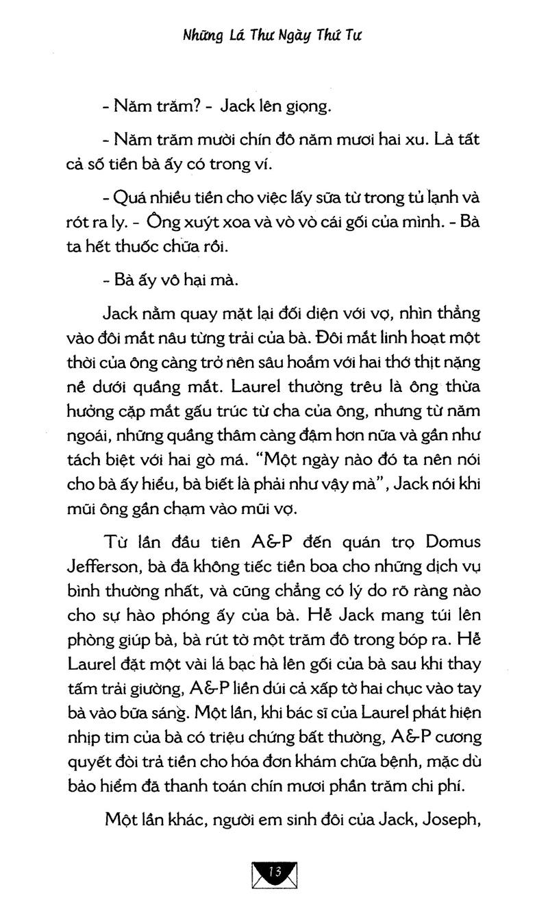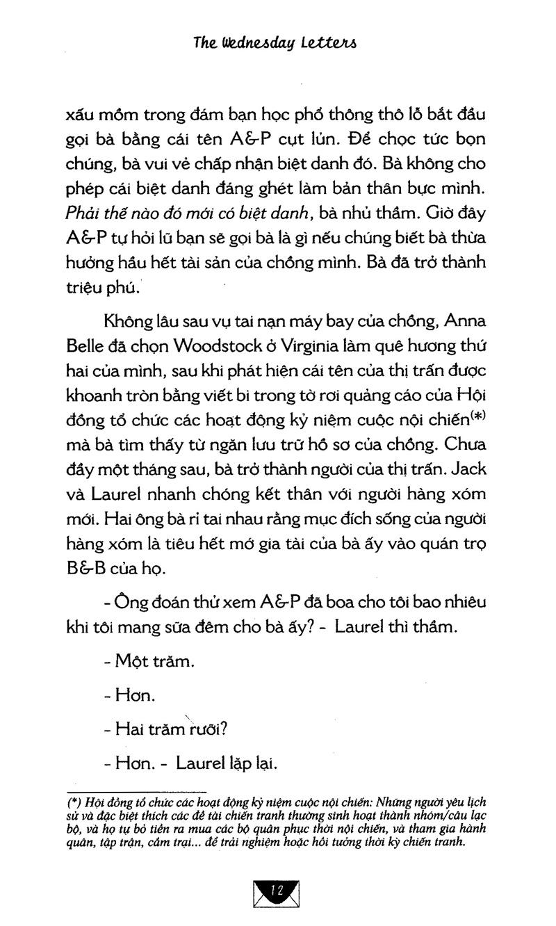 Hôm nay lúc ở nhà thờ anh đã lập một lời hứa thiêng liêng và tối nay anh sẽ lập thêm một lời hứa khác. Anh sẽ viết thư cho em mỗi tuần. Cho dù chúng ta ở cách xa nhau hàng ngàn cây số hay cùng ở trong một gian phòng thì anh vẫn sẽ đều đặn viết thư cho em. Anh đã định viết nhật ký đấy nhưng rồi anh sợ mình không duy trì được. Mà ai thèm quan tâm đến nhật ký của anh chứ? Nhưng nếu là thư thì sẽ có người quan tâm, và chúng sẽ tồn tại lâu dài..."