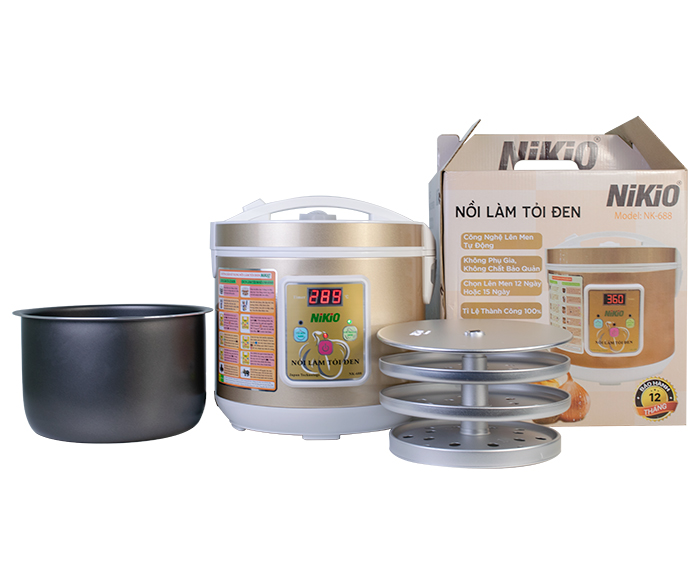 Nồi làm tỏi đen gia đình Nhật Bản Nikio NK-688 được sản xuất theo công nghệ hiện đại của Nhật Bản, thiết kế theo quy trình lên men tự động, làm tỏi đen nhanh chóng trong vòng 12 hoặc 15 ngày tùy vào chọn làm tỏi nhánh hay tỏi đơn, tiết kiệm thời gian và điện năng cho người dùng. Đồng thời mang lại hiệu quả cao, với tỷ lệ lên men thành công đạt tới 100% tỏi thành phẩm đạt yêu cầu. Sản phẩm được thiết kế với tháp 3 tầng làm được nhiều tỏi hơn khoản 1.5kg tỏi tươi, chất liệu xoong nồi cao cấp với công nghệ sơn tĩnh điện 2 lớp, mâm nhiệt 3 chiều giúp nhiệt lượng tỏa đều quanh nồi, tỏi đen được sấy đủ nhiệt vào những ngày cuối, giúp tỏi khô, chín đều, dẻo và thơm ngon giữ nguyên được dưỡng chất trong tỏi khi thành phẩm. Nồi làm tỏi đen Nikio là sản phẩm chất lượng được nhiều người tin dùng. Ưu điểm nổi bật Máy làm tỏi đen gia đình Nikio NK-688: