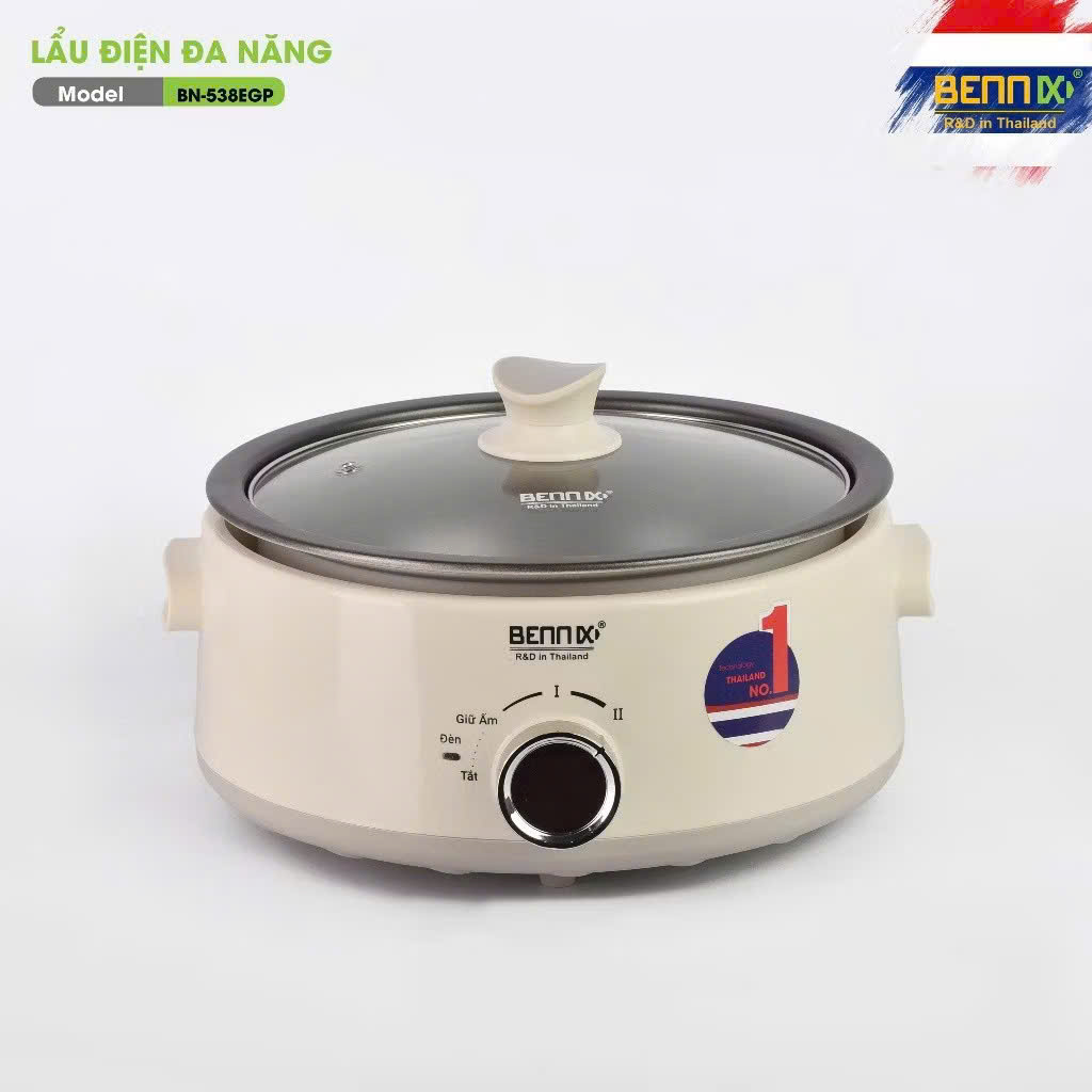 Tên sản phẩm: Nồi lẩu điện đa năng Model: BN-05EGP Thương hiệu: Bennix Thái Lan Sản xuất tại Việt Nam Dung tích: 5 lít Công suất: 1700W | Điện áp: 220V - 50Hz Lòng nồi: