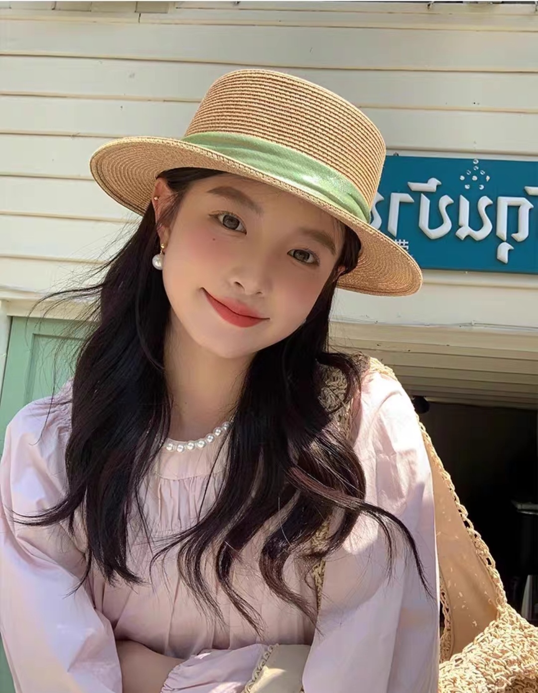 Mũ nón đi biển vành nhỏ chóp bằng phối đai trắng ngọc trai nhân tạo chất liệu cói chống nắng thoáng mát thời trang Hàn Quốc Chất liệu cói Kiểu dáng thời trang chống nắng