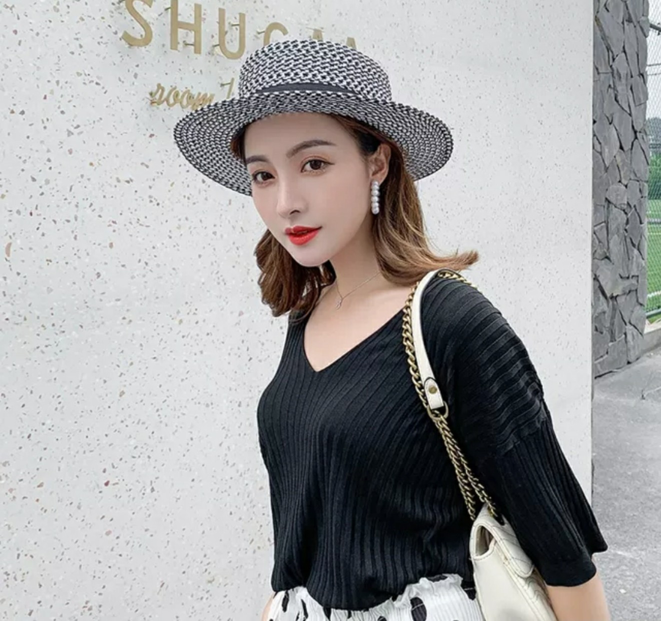 Mũ nón đi biển vành nhỏ chóp bằng phối đai trắng ngọc trai nhân tạo chất liệu cói chống nắng thoáng mát thời trang Hàn Quốc Chất liệu cói Kiểu dáng thời trang chống nắng