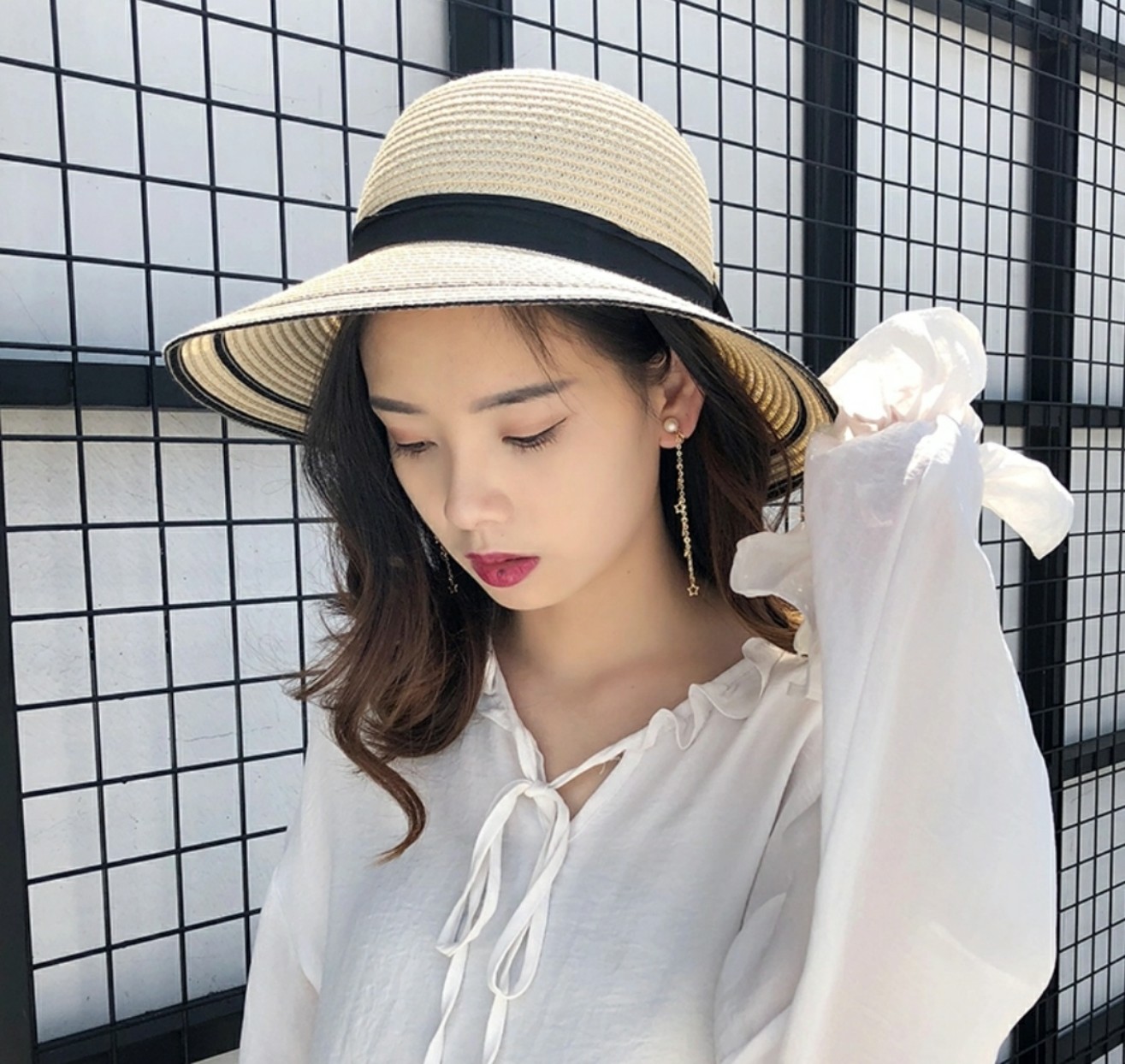 Mũ cói rơm vành phẳng nữ mùa hè phiên bản Hàn Quốc chống nắng UV cho kỳ nghỉ Nón đi biển Paris thời trang hàng đầu Pháp Chất liệu cói