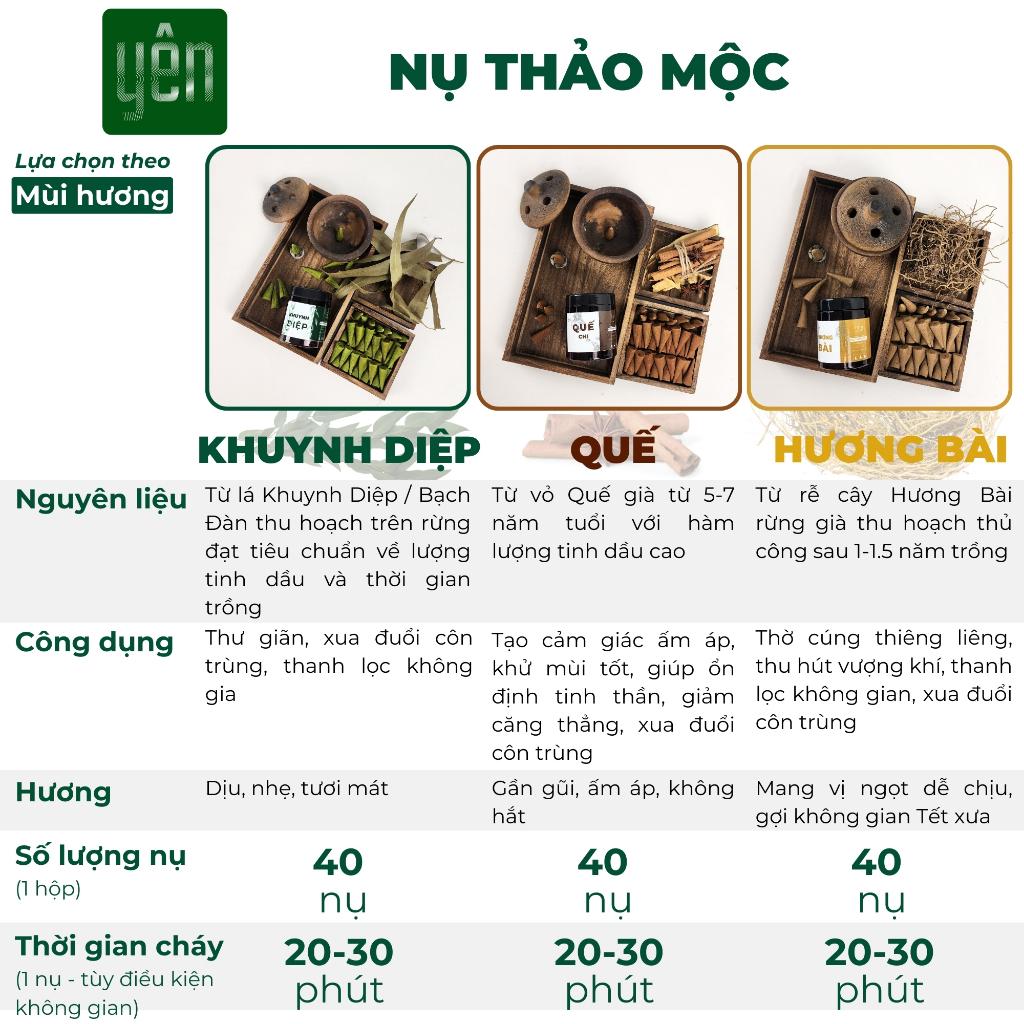 I.Thông tin sản phẩm Nhang Nụ Khuynh Diệp Nụ Khói Ngược Sạch Thảo Mộc Tự Nhiên YÊN Xuất xứ: làng nghề Tùng Lộc, huyện Can Lộc, tỉnh Hà Tĩnh. Thành phần nhang khuynh diệp: 98% làm từ lá khuynh diệp già nhiều tinh dầu (tại rừng Tùng Lộc), 2% bột bời lời (vỏ và gỗ cây bời lời được nghiền thành chất kết dính) và tăm tre mộc Số lượng nụ: 40 nụ / hộp (đựng trong túi zip, hút ẩm, hủ nhựa cao cấp) Thời gian cháy: 25 -35 phút / nụ (tùy điều kiện không gian) Quà tặng kèm vào các dịp sale lớn, ngày đôi, đầu tháng, giữa tháng và ngày lương về ️Luôn có mã giảm giá theo từng giá trị đơn Đóng gói kĩ đảm bảo an toàn Theo dõi shop để nhận ngay ưu đãi   Quà tặng kèm vào các dịp sale lớn, ngày đôi, đầu tháng, giữa tháng và ngày lương về ️Luôn có mã giảm giá theo từng giá trị đơn Đóng gói kĩ đảm bảo an toàn Theo dõi shop để nhận ngay ưu đãi   II. Công dụng và lợi ích của Nhang Nụ Khuynh Diệp Nụ Khói Ngược Sạch Thảo Mộc Tự Nhiên YÊN Thành phần hoàn toàn tự nhiên không pha lẫn bất kì tạp chất nên mùi hương dịu nhẹ, không có mùi hắc, an toàn cho người có vấn đề về hô hấp. Nhang nụ thảo mộc ít khói nên không gây cay mắt An toàn cho trẻ nhỏ, người già và phụ nữ mang thai Mùi hương nhang nụ thảo mộc có tính ấm nồng hỗ trợ phòng phòng cảm lạnh, giảm nghẹt mũi, có tác dụng đuổi côn trùng Tâm linh: Hương thơm của nhang thảo mộc đem lại sự nồng ấm cho không gian thờ cúng, giúp đẩy lùi tạp khí, xông thơm nhà, thu hút vượng khí. Sức khỏe: Mùi nhang thảo mộc sẽ tạo ra một bầu không khí thanh thản, giảm stress, dễ chịu, thúc đẩy sự tĩnh lặng và bình an nội tâm. Phù hợp để thiền, yoga.   III. Hướng dẫn sử dụng và bảo quản Nhang Nụ Khuynh Diệp Nụ Khói Ngược Sạch Thảo Mộc Tự Nhiên YÊN ️ Bảo quản nhang thảo mộc nơi khô ráo ️ Đậy kín hộp nhang khi không sử dụng ️ Do thời tiết vùng miền khác nhau có thể làm nhang bị ẩm nên YÊN luôn đóng gói sản phẩm với túi hút ẩm ️ Nếu nhang nụ thảo mộc bị ẩm có thể phơi nắng tầm 10 phút hoặc cho vào lò vi sóng tầm 3 giây và sử dụng như bình thường ️ Có thể dùng trong không gian kín và máy lạnh   IV. Cam kết từ YÊN Thảo Mộc 100% hoàn toàn thảo mộc tự nhiên thuần Việt Không pha tạp chất, không hóa chất Hương thanh khiết, dịu nhẹ và ít khói Đã dùng 1 lần là sẽ luôn quay lại Chất lượng sản phẩm được công nhận bởi Bộ Khoa Học và Công Nghệ Giá bán từ xưởng không qua trung gian   V. Về YÊN Thảo Mộc YÊN Thảo Mộc chuyên sản xuất các sản phẩm có nguồn gốc 100% từ thảo mộc thuần Việt chất lượng cao bao gồm nhang quế, nhang khuynh diệp, nhang hương bài, nhang nụ thảo mộc, tinh dầu… YÊN Thảo Mộc với triết lý sản phẩm giúp người dùng “yên tự tâm”. Không chỉ là sản phẩm tâm linh, 100% sạch từ nguyên liệu thảo mộc tự nhiên, mà còn là một liệu pháp giúp bạn thư giãn, tái tạo năng lượng và tìm lại sự cân bằng trong cuộc sống.   Xuất phát điểm là một gia đình làm nhang cha truyền con nối ở làng nghề Tùng Lộc, tỉnh Hà Tĩnh. Mỗi sản phẩm của YÊN Thảo Mộc không chỉ được tạo nên từ đôi tay chai sạn và sự tâm huyết của người thợ, mà còn là kết tinh của cả một quá trình lao động sáng tạo, và là lời tri ân gửi đến thiên nhiên và tổ tiên.