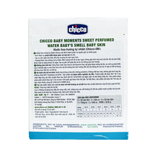 Nước hoa hương tự nhiên Chicco với 96% thành phần có nguồn gốc tự nhiên giúp: - Kích thích sự phát triển khứu giác và não bộ cho Bé. - Tạo ra cảm giác thư thái, dễ chịu và giúp bé ngủ ngon hơn. - Hương thơm nhẹ nhàng và tự nhiên: Mùi hương tinh tế và dịu ngọt, không gây kích ứng mũi của Bé. Bé sẽ cảm thấy thơm mát và sảng khoái cả ngày. Tạo sự gắn kết giữa Bé và ba mẹ thông qua mùi hương. Không làm khô da: Công thức nước hoa Chicco với Grycerin thực vật giúp tăng cường độ ẩm, giảm sự phát triển của vi khuẩn gây ra mùi khó chịu trên da Bé không làm ảnh hưởng đến độ cân bằng pH của da. Vì vậy có thể sử dụng để thoa trực tiếp lên cơ thế Bé. An toàn cho trẻ sơ sinh: Nước hoa không chứa cồn, không parabens, không chất tạo màu, không gây kích ứng da. Hướng dẫn sử dụng: Thoa trực tiếp lên da Bé. Lưu ý: Không sử dụng trực tiếp lên vùng mắt, mũi, miệng hay các vết thương hở. Để sản phẩm tránh xa tầm với của trẻ. Bảo quản ở nơi khô ráo, thoáng mát, tránh ánh nắng trực tiếp.