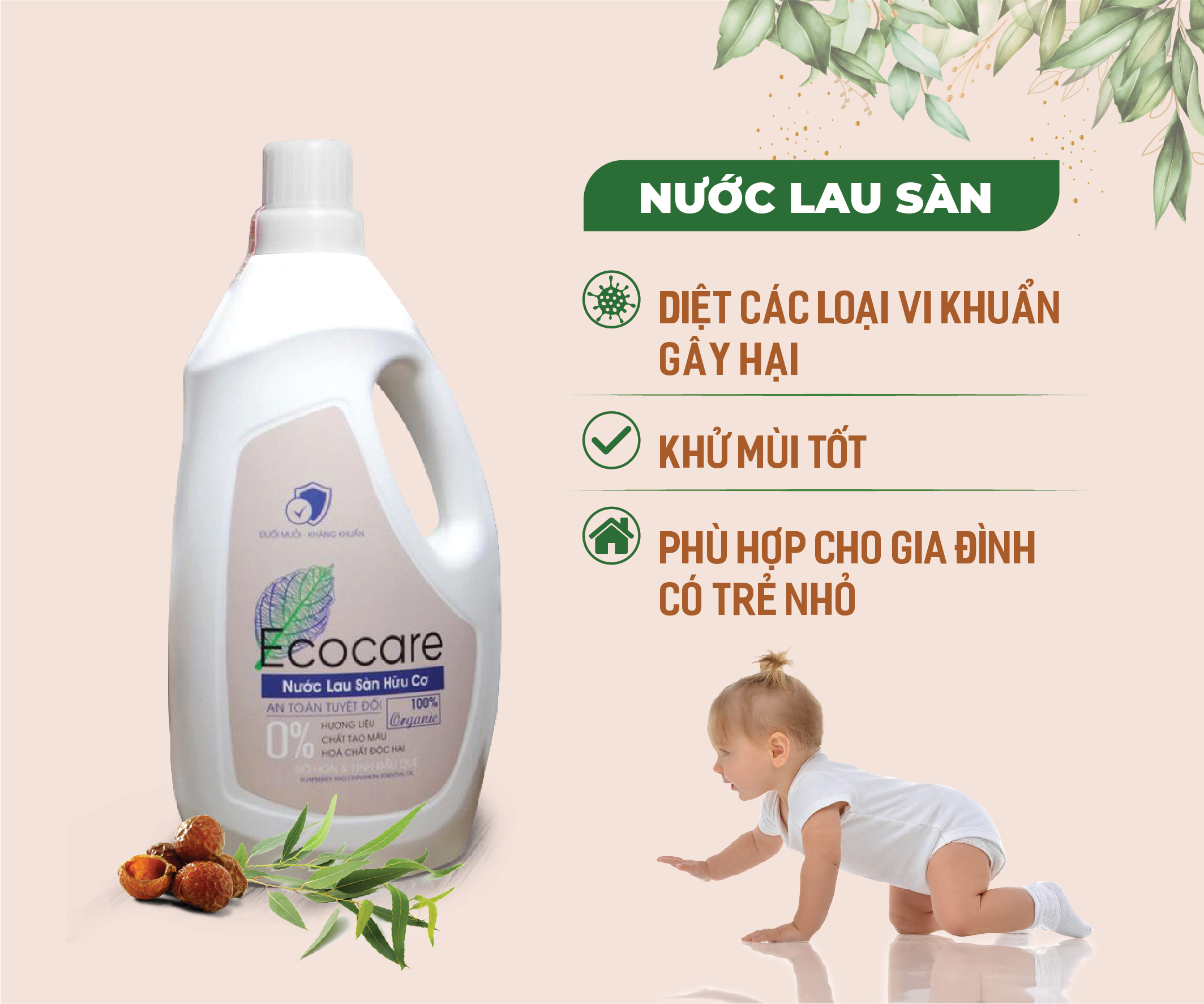 - Sản phẩm Nước lau sàn hữu cơ Bồ hòn Ecocare cam kết: 0% hương liệu, 0% chất tạo màu, 0% chất hóa học độc hại -Hoàn toàn thân thiện với môi trường, sử dụng bao bì là nhựa tái chế