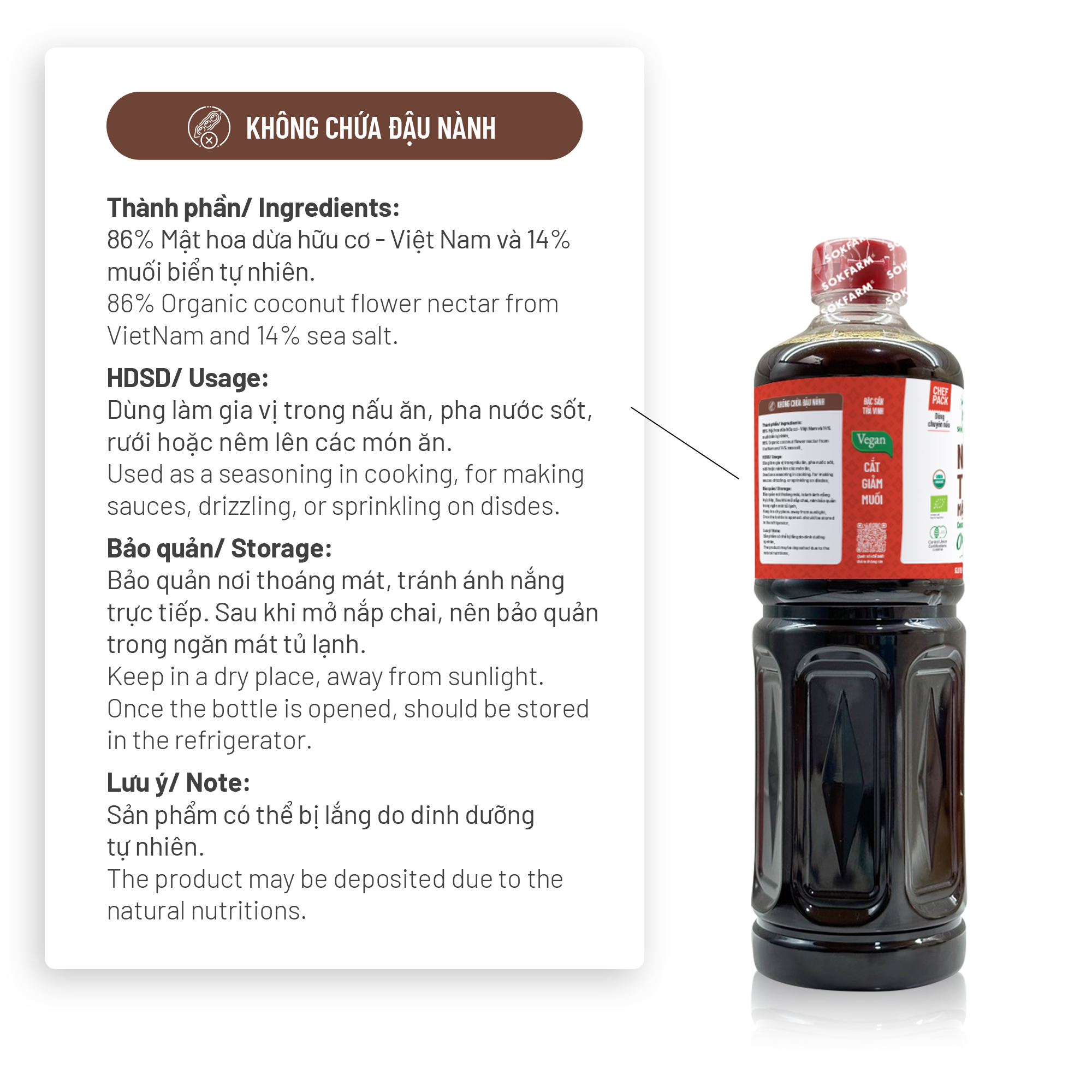 Nước tương mật hoa dừa Sokfarm - nước tương thuần chay ít muối, không từ đậu nành, không chất bảo quản, không chất điều vị, không hương liệu, không chất tạo màu