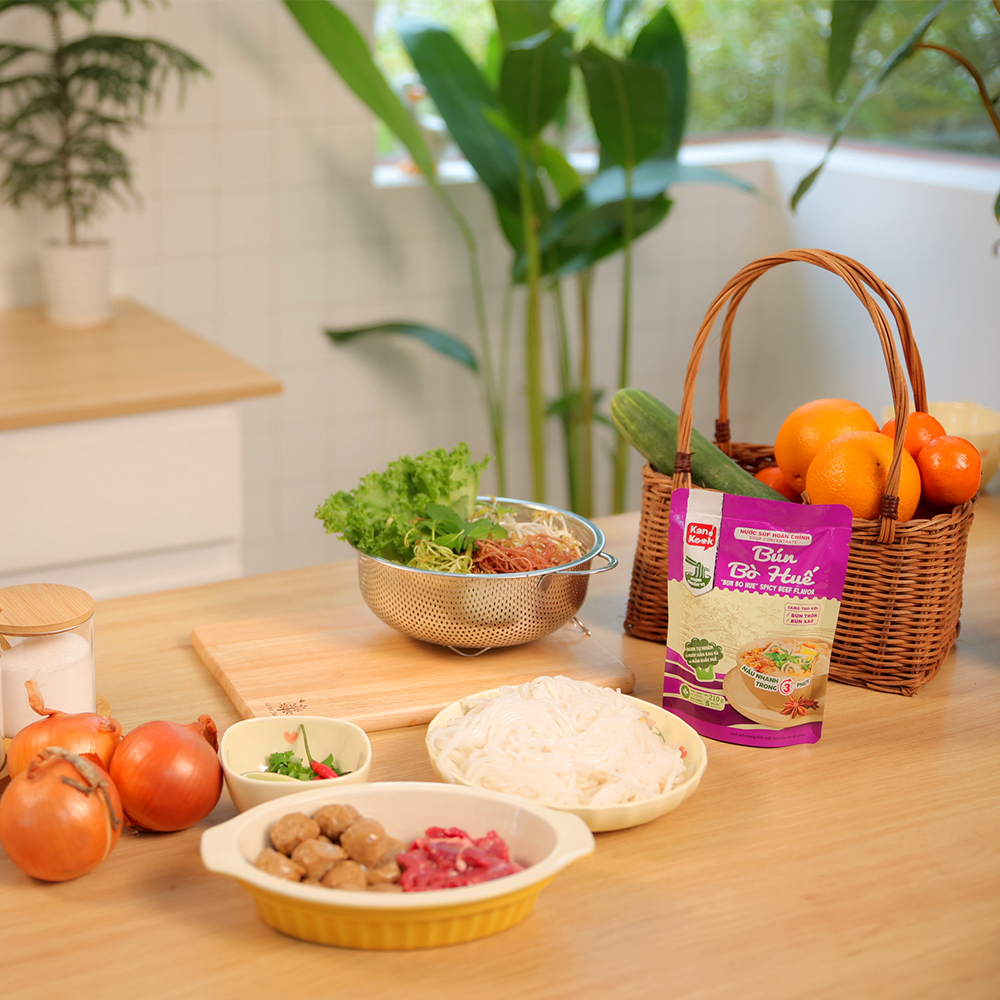 - Dùng 20g (khoảng 1 muỗng cơm) nước súp hoàn chỉnh Phở Gà KanKook trộn hoặc xào với 150g bánh phở (khẩu phần 1 người).