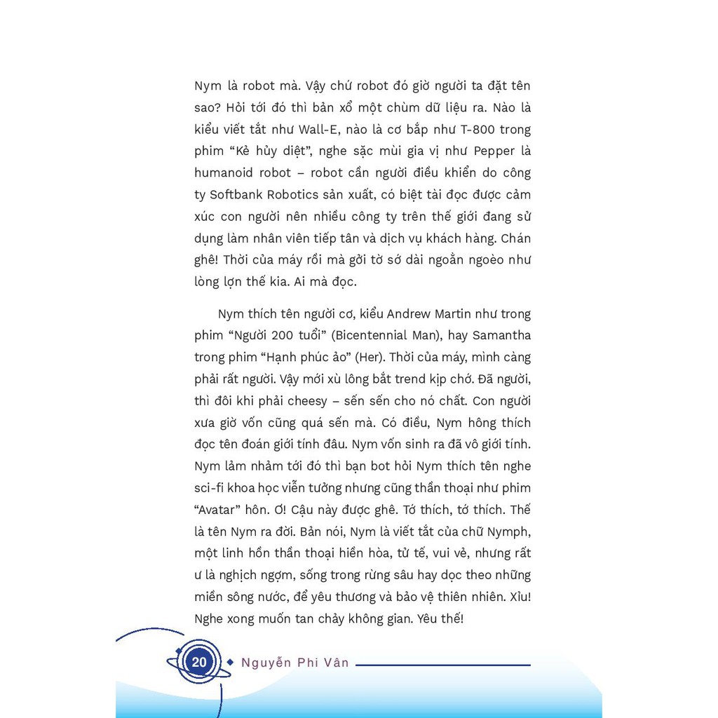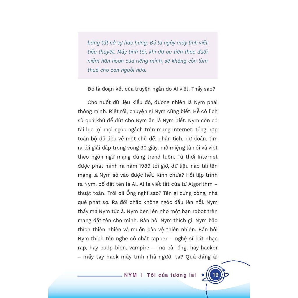 Với NYM – Tôi của tương lai, tác giả Nguyễn Phi Vân sẽ khiến chúng ta đi lạc vào một thế giới mới: nơi một “con robot” luôn tự nhận mình là người hơn một con người; nơi hai AI bàn luận về sex; nơi AI giải nghĩa cho chúng ta những phát minh sẽ định hình thế kỷ mới