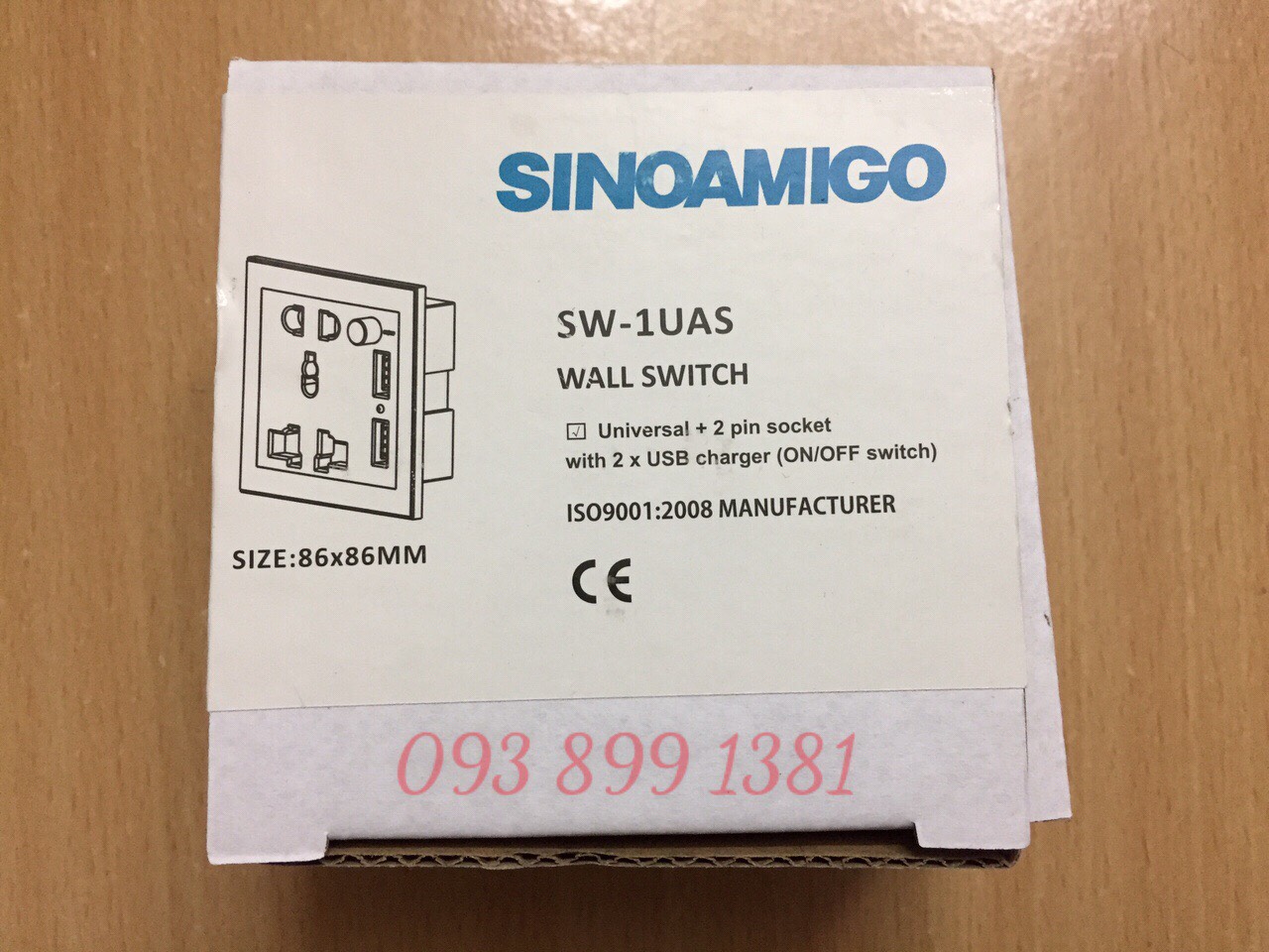 Mặt ổ cắm điện Sinoamigo SW-1UAS được thiết kế hình vuông với kích thước (dài, rộng, cao) 86 x 86 x 46.6mm)