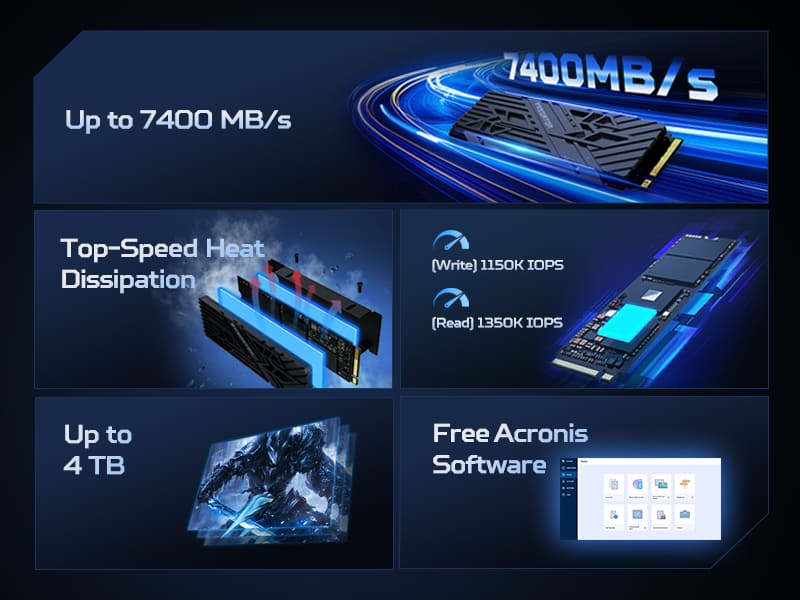 Ổ cứng Gaming SSD Acer Predator GM7000 Heatsink 512GB / 1TB / 2TB PCIe Gen 4x4, Tốc độ đọc Up to 7400 MB/s Bảo hành 5 năm Predator GM7000 Heatsink là bản cải tiến của Predator GM7000, được bổ sung thêm vỏ tản nhiệt để cải thiện tình trạng quá nhiệt của SSD PCIe Gen 4 hiệu suất cao. Thiết kế Heatsink giúp ổn định hiệu suất, hạn chế tình trạng giật lag khi phải hoạt động liên tục trong thời gian dài, đồng thời tăng cường tuổi thọ cho SSD cũng như thiết bị.   GM7000 Heatsink, công nghệ tản nhiệt tiên tiến   Predator GM7000 Heatsink là dòng SSD PCIe Gen 4 tốt nhất Hãng với tốc độ đọc lên đến 7400 MB/giây và dung lượng lên đến 4 TB cho trải nghiệm chơi game mượt mà. Với tản nhiệt tùy chỉnh và bộ nhớ đệm DRAM độc lập, GM7000 Heatsink có khả năng tản nhiệt tốc độ cao và đọc và ghi ngẫu nhiên hiệu quả. Ngoài ra, bạn sẽ nhận được phần mềm tùy chỉnh miễn phí của Predator để truyền dữ liệu nhanh chóng và bảo hành có giới hạn 5 năm.   Giải pháp làm mát, hệ thống tản nhiệt GM7000 2.0   Được thiết kế với bộ tản nhiệt tùy chỉnh, ổ cứng Predator GM7000 Heatsink tích hợp hệ thống ống dẫn khí hiệu quả đặc biệt để tản nhiệt. Điều này cải thiện khả năng tản nhiệt thông qua làm mát bằng không khí cưỡng bức và giảm nhiệt độ hoạt động của SSD tới 25%.   Tốc độ đọc và ghi cực nhanh lên đến 7400 MB/s Predator GM7000 Heatsink cung cấp tốc độ đọc và ghi tuần tự lên đến 7400 MB/s để tải trò chơi siêu nhanh và truyền tệp lớn. Tốc độ đọc và ghi tuần tự cao ở tốc độ này đảm bảo chơi game mượt mà mà không bị rớt khung hình.   Cấu hình hệ thống thử nghiệm: Bộ xử lý AMD Ryzen 7 5800X 8 nhân @3,80 GHz, DDR4 2666 MHz 16 GB x 2, hệ điều hành Windows 11 Pro 64 bit, chipset PRIME X570-PRO. Dữ liệu trên đến từ các thử nghiệm trong phòng thí nghiệm và có thể thay đổi do thiết bị và môi trường khác nhau.   Bộ nhớ đệm DRAM độc lập tích hợp cho hiệu suất cao   Được trang bị bộ nhớ đệm DRAM độc lập dung lượng lớn, Predator GM7000 vỏ tản nhiệt mang lại hiệu suất tốt hơn khi đọc và ghi ngẫu nhiên, giúp giảm đáng kể tình trạng ghi dữ liệu không hợp lệ – và kéo dài tuổi thọ sản phẩm.   Truyền nhanh, Bảo vệ nhiều dữ liệu   GM7000 Heatsink sử dụng bộ điều khiển 8 kênh hàng đầu 12nm để hoạt động nhanh hơn, cung cấp tốc độ truyền dữ liệu nhanh hơn. Nhiều biện pháp bảo vệ dữ liệu được tích hợp trong GM7000 Heatsink để đảm bảo an toàn dữ liệu.   4K LDPC ECC: So với 2K LDPC, 4K LDPC ECC kéo dài đáng kể tuổi thọ của SSD, mang lại độ tin cậy tốt hơn và hiệu suất cực cao. Mã hóa AES: So với mã hóa phần mềm, mã hóa phần cứng AES có thể xử lý dữ liệu nhạy cảm hơn và cung cấp khả năng bảo vệ dữ liệu vượt trội cho các ứng dụng. Bảo vệ dữ liệu đầu cuối: Khi ghi dữ liệu, một tổng kiểm tra được tạo và ghi vào bộ nhớ flash cùng với dữ liệu người dùng. Sau đó, tổng kiểm tra được sử dụng để kiểm tra xem dữ liệu người dùng đã hoàn tất chưa (và có bất kỳ lỗi nào trong quá trình truyền và lưu trữ giữa các thành phần trong SSD hay không). Điều này cải thiện độ tin cậy của dữ liệu.   Lên đến 4 TB: Dung lượng lớn cho hiệu suất nâng cao GM7000 Heatsink cung cấp dung lượng tùy chọn lên đến 4TB, hỗ trợ các hoạt động lưu trữ chuyên sâu — từ tải xuống game AAA đến lưu các tệp mô hình dựng hình lớn.   Phần mềm Acronis miễn phí, sao lưu, sao chép và khôi phục   Với phiên bản tùy chỉnh miễn phí của Acronis True Image OEM, bạn sẽ có thể dễ dàng chuyển dữ liệu và sao lưu. Cũng như một cách để di chuyển dữ liệu của bạn từ ổ SSD cũ sang ổ SSD mới, phần mềm sao chép này có thể khôi phục hệ thống của bạn trong trường hợp khẩn cấp.