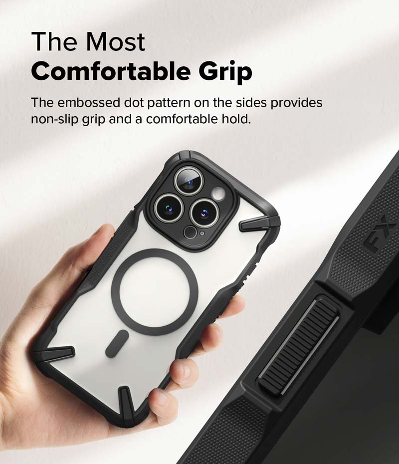 Sản phẩm ốp lưng iPhone 16 Pro Max/16 Pro của Ringke dòng Fusion X Magnetic với thiết kế chống sốc bảo vệ điện thoại của bạn cực tốt, cùng với những gờ nổi ở mặt lưng mang đến cảm giác cầm nắm vô cùng chắc chắn.