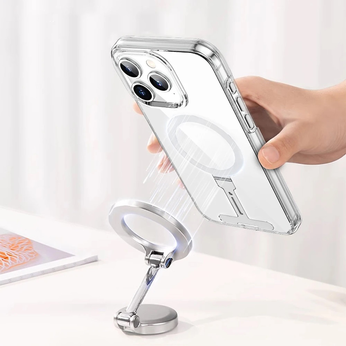 - Đây là một chiếc ốp lưng có chân đế chắc chắn và đa năng, được làm từ nhôm cấp hàng không nhẹ và bền. Ốp lưng này giúp dựng đứng điện thoại ở cả hai chế độ ngang và dọc, cho phép bạn xem TV hoặc Facetime với gia đình một cách thoải mái. Với thiết kế công thái học, nó cung cấp góc nhìn tốt nhất cho mắt của bạn. Chân đế cũng giúp bạn dễ dàng cầm nắm bằng một tay. Tương Thích Với Phụ Kiện MaQSafe: