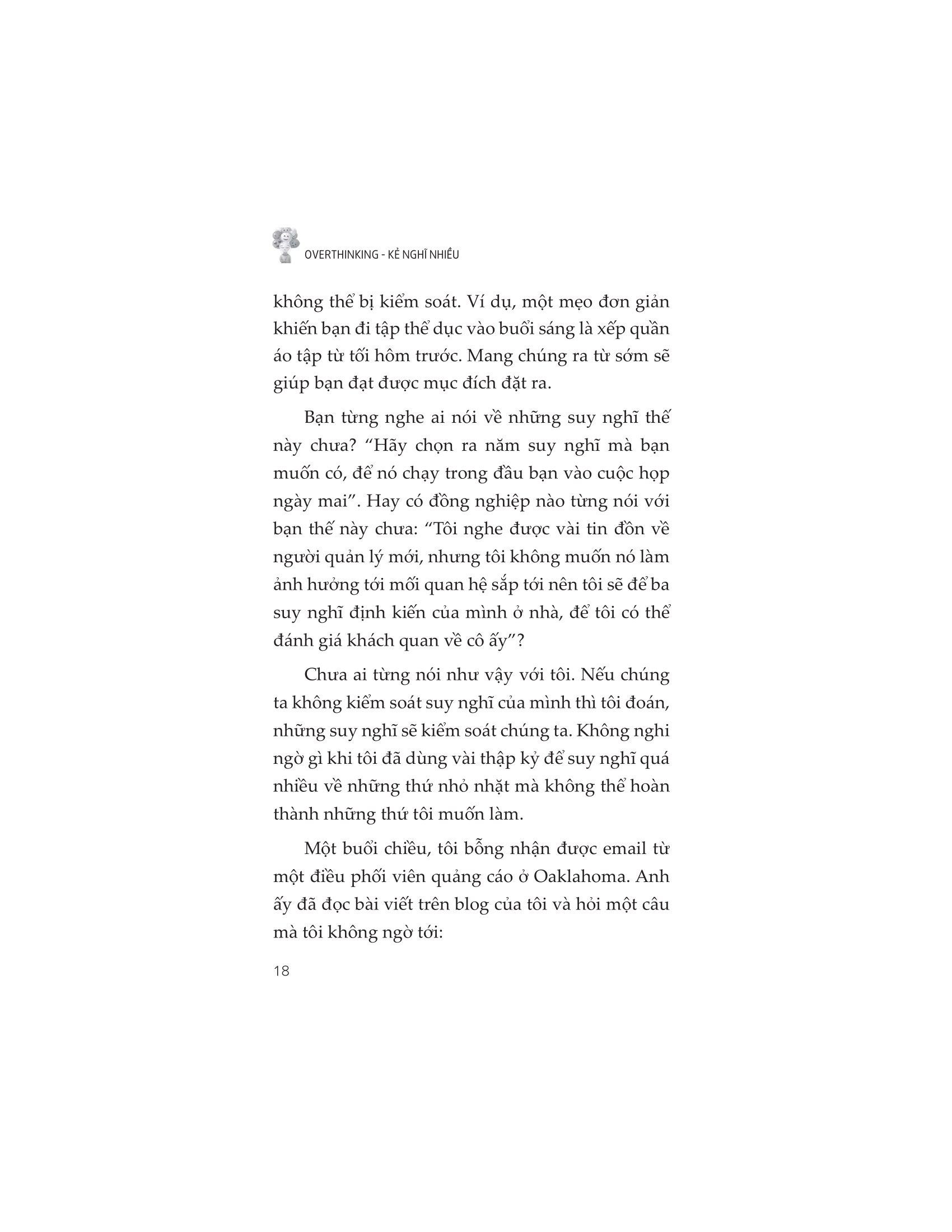 Overthinking - Kẻ Nghĩ Nhiều Đi cùng sự phát triển của xã hội, tất cả mọi người, đặc biệt là giới trẻ hiện nay gặp nhiều những vấn đề khác nhau trong cuộc sống, đặc biệt là những áp lực về tâm lý. Chúng ta thường mắc phải “căn bệnh Overthinking” - suy nghĩ nhiều về một sai lầm trong quá khứ và lo lắng thái quá về những chuyện ở tương lai. Suy nghĩ quá nhiều, về bản chất, diễn ra khi não của bạn xoay vòng quanh một ý nghĩ hay một ý kiến trong một thời gian dài, dài hơn mức cần thiết. Và điều không may là những suy nghĩ này thường có xu hướng trở nên mỗi lúc một tiêu cực. Overthinking là kẻ thù tệ hại nhất, giữ chân bạn trên con đường thực hiện những gì m.ình muốn. Nó là một trong những thứ đắt đỏ nhất trên đời, bởi vì, nó tiêu tốn công sức, làm lãng phí thời gian và cả sự sáng tạo. Đây chính xác là một loại dịch bệnh của việc dừng tiến lên, là cơn sóng thần của sự bế tắc. Với cuốn sách “Overthinking – Kẻ nghĩ nhiều”, bạn sẽ học được cách biến những suy nghĩ của m.ình thành hành động. Bạn có thể tận dụng thời gian, công sức và sự sáng tạo có thể tái tạo để tạo ra cuộc sống mà bạn muốn. Và nó bắt đầu bằng việc nhận ra bản chất của những suy nghĩ – là một bài hát của cuộc đời m.ình. Về tác giả: Jon Acuff được tạp chí Inc. Magazine vinh danh là 1 trong 100 diễn giả về quản lý, lãnh đạo nổi bật. Ông đã diễn thuyết ở nhiều quốc gia trên thế giới cho các tập đoàn lớn như Microsoft, Nissan, Walmart, FedEx, và Comedy Central. Lời khen dành cho cuốn sách: “Jon Acuff đã phát hiện ra chướng ngại cản trở chúng ta thành công và tạo ra một kế hoạch để vượt qua nó. Cho nên đừng suy nghĩ quá nhiều để quyết định. Hãy chọn ngay cuốn sách hài hước hữu ích này đi, và chuẩn bị giấy để ghi chú nhé”. Daniel , tác giả nổi tiếng của New York Times với cuốn sách When, Drive, và To Sell Is Human “Nếu bạn đã sẵn sàng thay đổi định hướng của cuộc đời, Jon Acuff ở đây để giúp bạn làm được điều đó. Đây là một cuốn sách đơn giản, có sức ảnh hưởng và hữu ích, nó là thứ bạn sẽ nhớ tới mỗi ngày trong suốt quãng đời còn lại”. Seth Godin, tác giả của Câu chuyện tiếp thị trong thời đại kỹ thuật số “Tôi không thể đếm hết số lần từng nói với các nhà lãnh đạo, ‘Anh đang suy nghĩ quá nhiều cho một quyết định’. Nó là kẻ thù tự nhiên của sự tập trung, và tôi rất mừng vì Jon Acuff đã không ngại gian khổ, nỗ lực hết m.ình để tìm ra cái nhìn mới về một chủ đề quan trọng như thế này”. Michael Hyatt, tác giả nổi tiếng của New York Times với cuốn The Vision Driven Leader