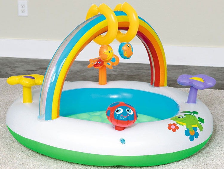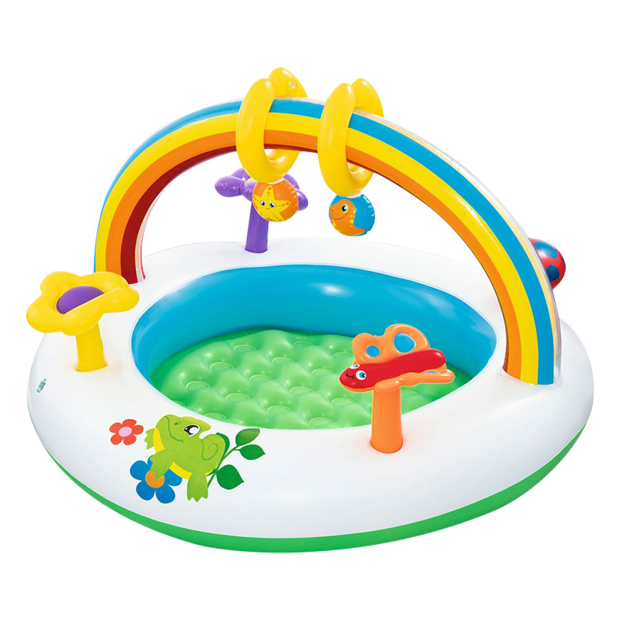 - Là một trong những sản phẩm bán chạy trong dòng bể phao dành cho bé. Thiết kế dạng hình cầu vồng có nhiều màu sắc đẹp mắt, có nhiều chi tiết trên thành phao gây chú ý ham thích khám phá của trẻ.