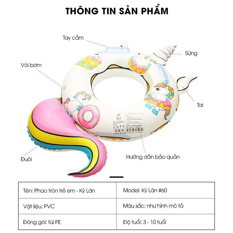* Thông tin cơ bản : Phao bơi tròn trẻ em dễ thương Kỳ Lân DJS-98 60cm - Chất liệu: Nhựa tổng hợp PVC (Polyvinylclorua) không gây độc hại, không kích ứng da, an toàn với