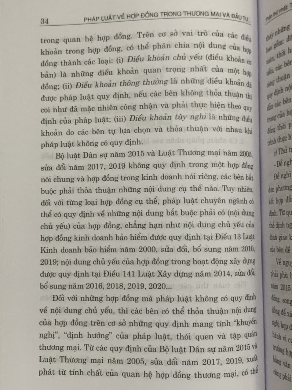 Trong lần xuất bản này, cuốn sách được các tác giả chỉnh sửa và cập nhật các quy định liên quan đến chế định hợp đồng của Luật Thương mại năm 2005, sửa đổi, bổ sung năm 2017, 2019; Luật Doanh nghiệp năm 2020, sửa đổi, bổ sung năm 2022; Luật Đầu tư năm 2020, sửa đổi, bổ sung năm 2022; Luật Đầu tư theo phương thức đối tác công tư năm 2020, sửa đổi, bổ sung năm 2022; Bộ luật Dân sự năm 2015… cùng các văn bản hướng dẫn thi hành. Cuốn sách cung cấp cho bạn đọc những kiến thức chuyên sâu, cụ thế về các loại hợp đồng cơ bản trong hoạt động thương mại và đầu tư tại nước ta. Ngoài ra, cuốn sách cũng giới thiệu những kỹ năng cơ bản khi soạn thảo, ký kết hợp đồng cùng các mẫu hợp đồng phổ biến trong hoạt động thương mại và đầu tư, giúp các bên trong hợp đồng phòng, tránh được những rủi ro pháp lý, giảm thiểu các tranh chấp trong hoạt động kinh doanh.
