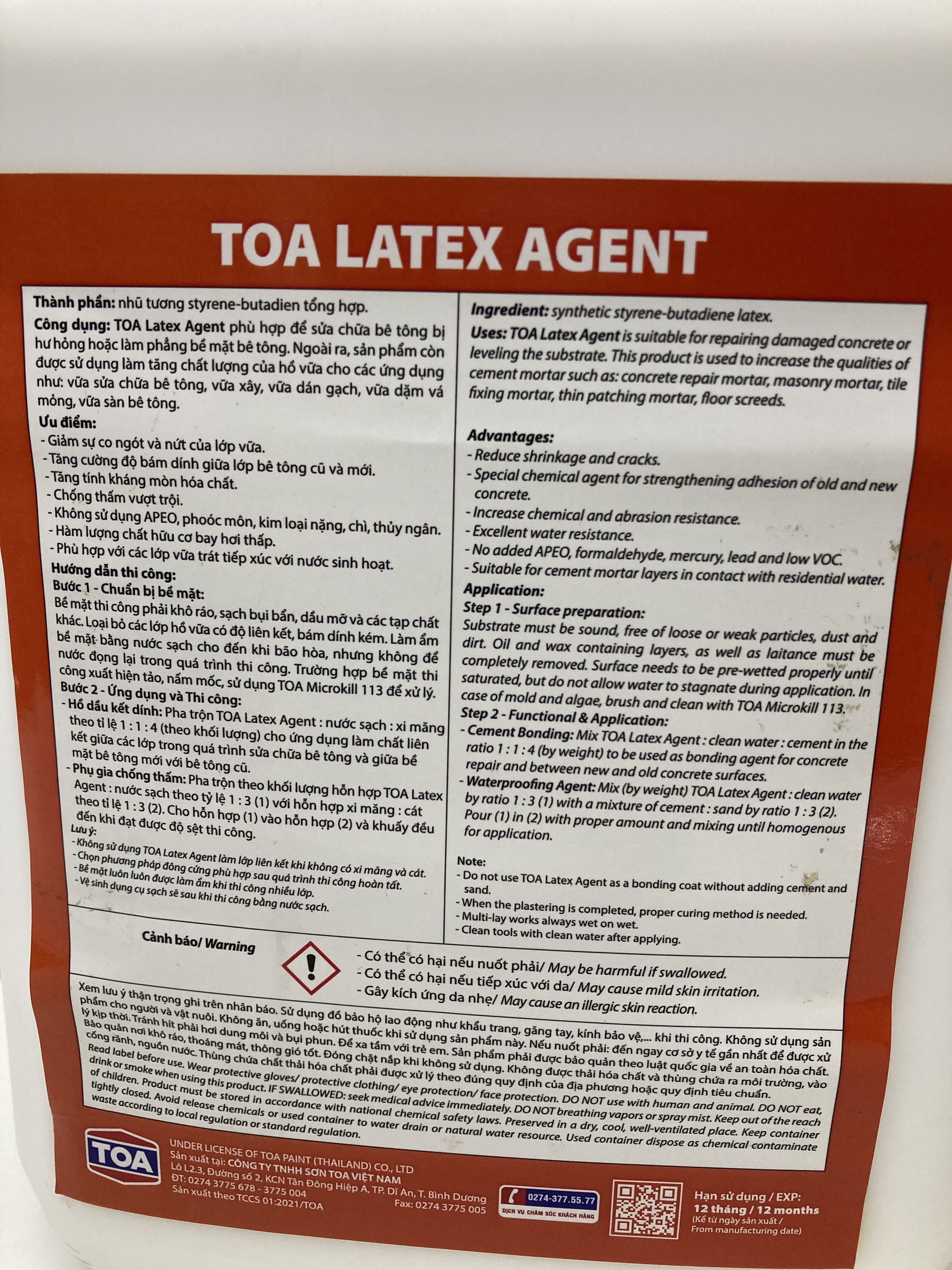 Phụ Gia Chống Thấm TOA Latex Agent_ 5L/can Thành phần: Nhũ tương Styrene-butadien tổng hợp. Toa Latex Agent dùng để sửa chữa bê tông bị hư hỏng hoặc làm phẳng bề mặt bê tông, giúp