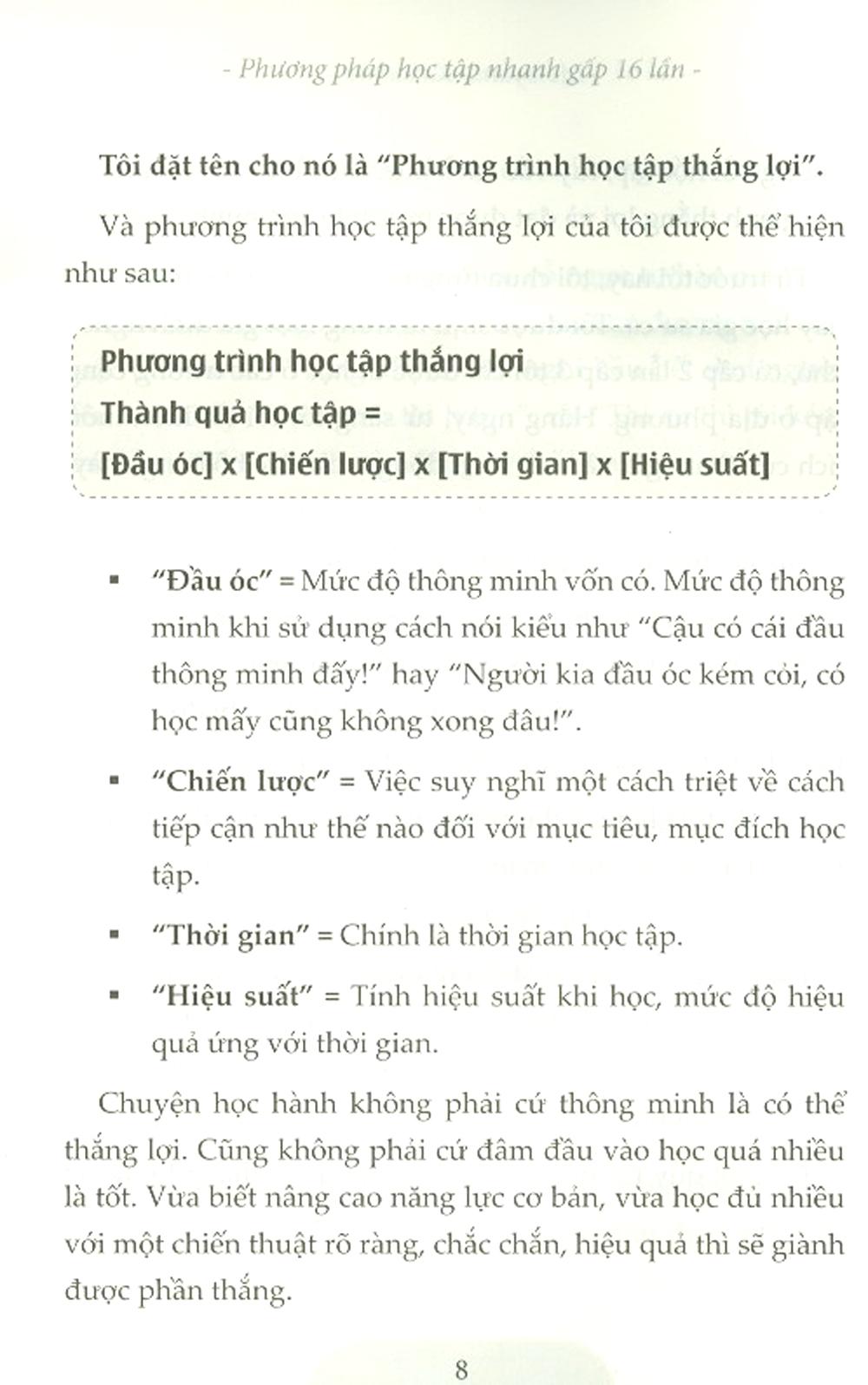 Phương Pháp Học Nhanh Gấp 16 Lần Người ta thường nói “người học kém không biết cách học”. Ngoài ra, có những người mặc dù đã quyết tâm học tập, dành rất nhiều thời gian để học rồi mà không có hiệu quả mấy thì mới thấy họ toàn dành thời gian chỉ để nào là viết sao cho cuốn vở thật đẹp, nào là ngồi ngắm nghía mấy cuốn sách tham khảo. Học hành luôn có bí quyết của nó. Vì tài nguyên thời gian học tập thì có giới hạn và nếu rõ ràng là học mà mất ít thời gian thì sẽ tốt hơn, cho nên cần phải nắm bắt được những bí quyết học tập để đẩy hiệu suất đến mức cao nhất. Nâng cao khả năng tập trung cũng là yếu tố quan trọng để gia tăng hiệu suất học tập. Và để tập trung vào học tập thì có thể kể tới các biện pháp như nâng cao tiềm năng được gọi là khả năng tập trung vốn dĩ của mỗi người, thiết lập cho m.ình một môi trường dễ dàng để tập trung. Tất nhiên, có thể cũng có những bài luyện tập để nâng cao khả năng tập trung nhưng tôi cho rằng bất cứ ai cũng mang sẵn trong m.ình khả năng tập trung tiềm tàng. Con người là loài có thể phát huy khả năng tập trung một cách đáng kinh ngạc vào những việc họ yêu thích. Khả năng tập trung khi chơi game của một người nghiện game thực sự rất đáng nể. Khi một người thích thể thao hay một người thích nấu ăn được làm những gì họ yêu thích, họ sẽ tập trung vào việc đó. Vậy phải chăng họ không thể tập trung vào cả việc học hành sao? Câu trả lời là “sẽ là CÓ tùy vào sự nỗ lực tìm tòi của mỗi người”. Nếu biết cách thiết lập, đảm bảo môi trường đủ tốt, biết đầu tư, tìm tòi cách thức học hành, biết chuyển đổi nhịp nhàng giữa ý thức và ý tưởng thì chắc chắn sẽ có thể phát huy được khả năng tập trung ngay cả trong hoạt động học tập. Và khi ấy, hiệu suất học tập sẽ có thể tăng lên gấp 2, gấp 3, thậm chí là gấp 5 lần. Với cuốn sách “Phương pháp học nhanh gấp 16 lần” sẽ giúp bạn học tập một cách hiệu quả!