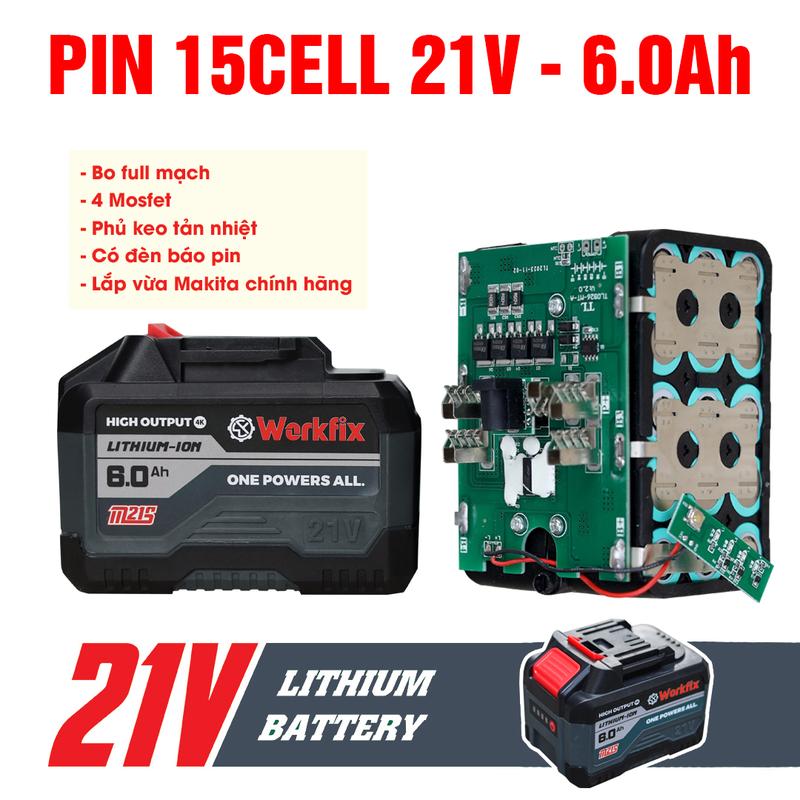 ✨Pin Máy Khoan 15 Cell Workfix, 21 Volt - 6 Ah,Chân Pin thông dụng, Mạch 4 mosfet dòng xả cao, Vỏ Pin chống cháy, chống va đập - dùng cho máy khoan pin , mài pin, siết bulong pin, rửa xe pin, cắt cỏ pin..vv