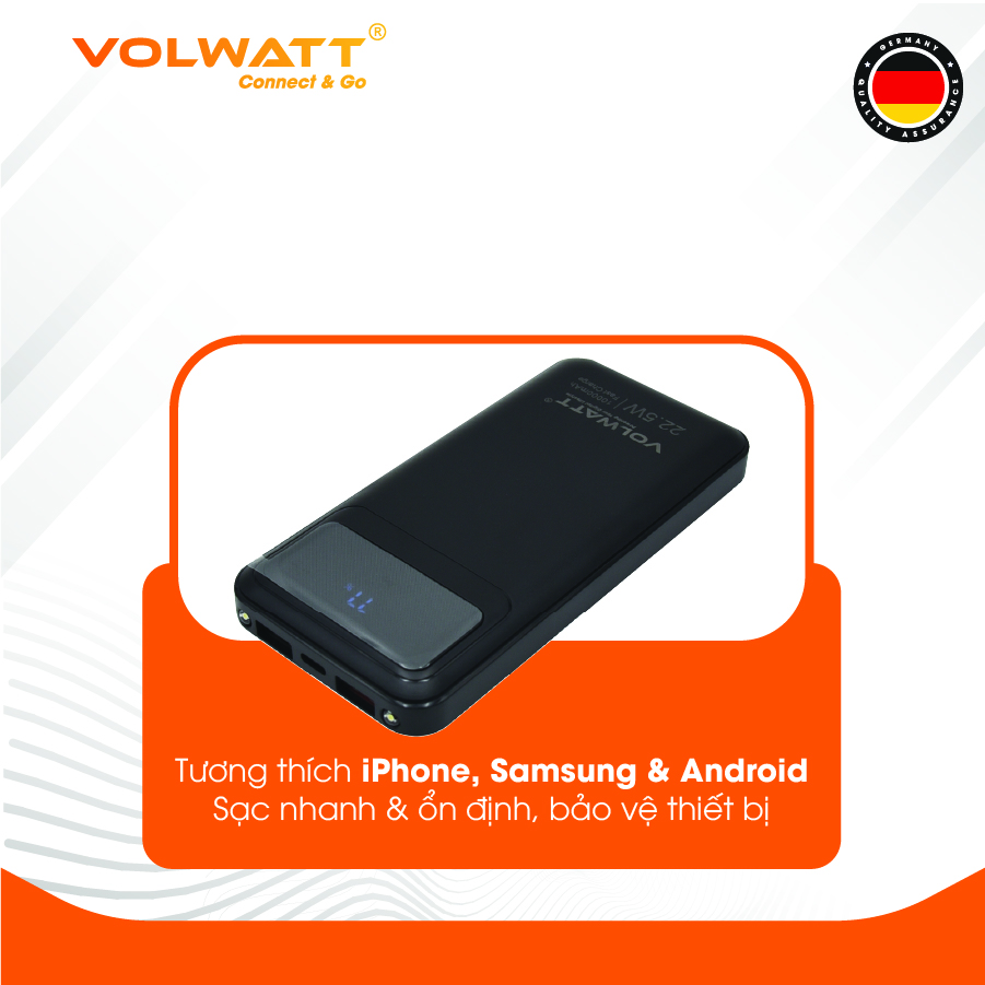 Volwatt GE-10K5 là giải pháp sạc di động toàn diện: nhỏ gọn, mạnh mẽ, an toàn tuyệt đối. Với công suất sạc nhanh 22.5W và dung lượng 10.000mAh, sản phẩm có thể sạc nhanh cho iP, smartphone Android, tablet và nhiều thiết bị khác.