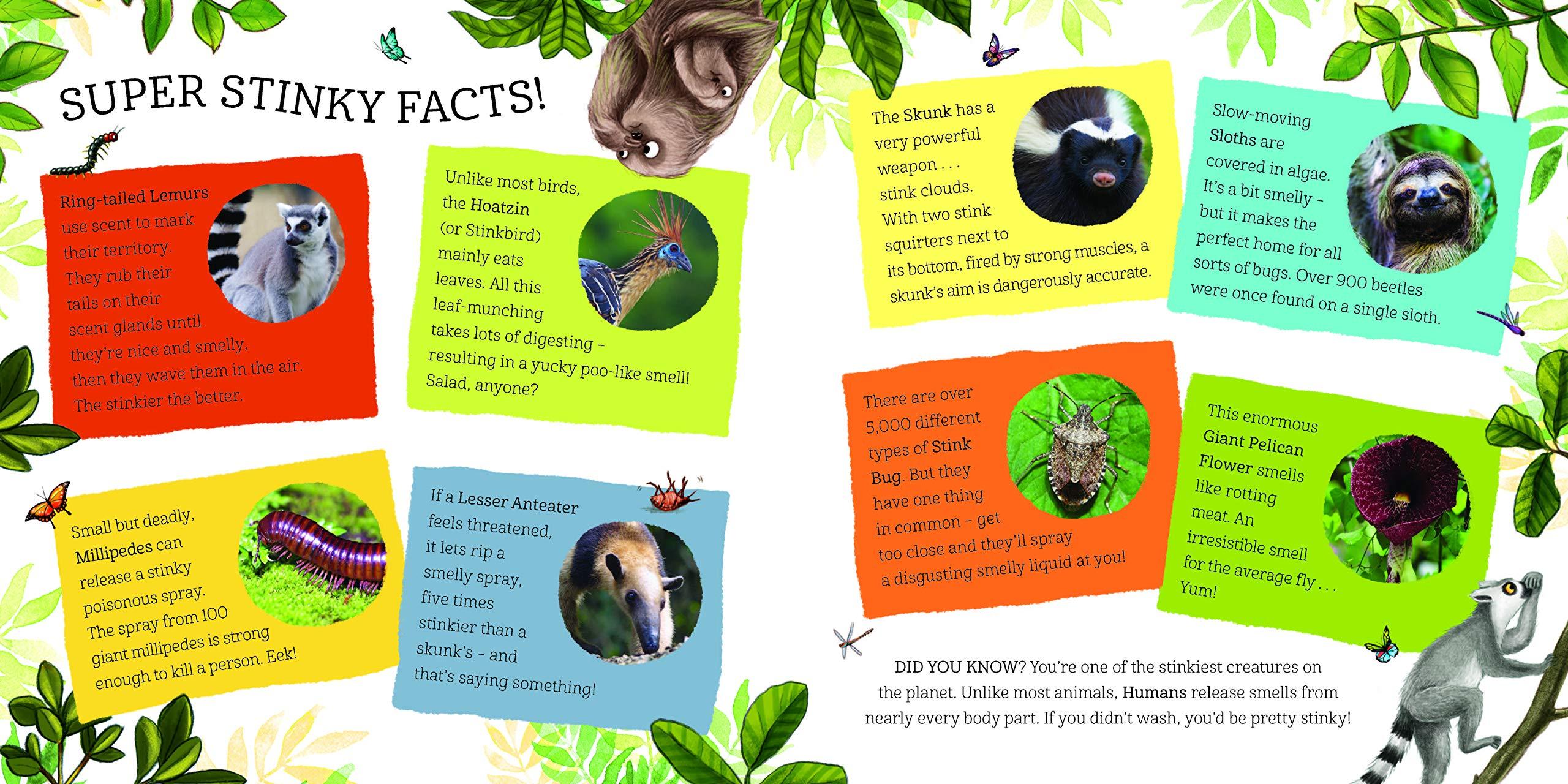 Learn about sloths, skunks, stinkbugs and more in the whiff-tastic Poo! Is That You? written by Clare Helen Welsh and illustrated by Nicola O'Byrne. Cleverly interweaving facts throughout, it also contains an information page at the back of the book, with a photo of each animal.
