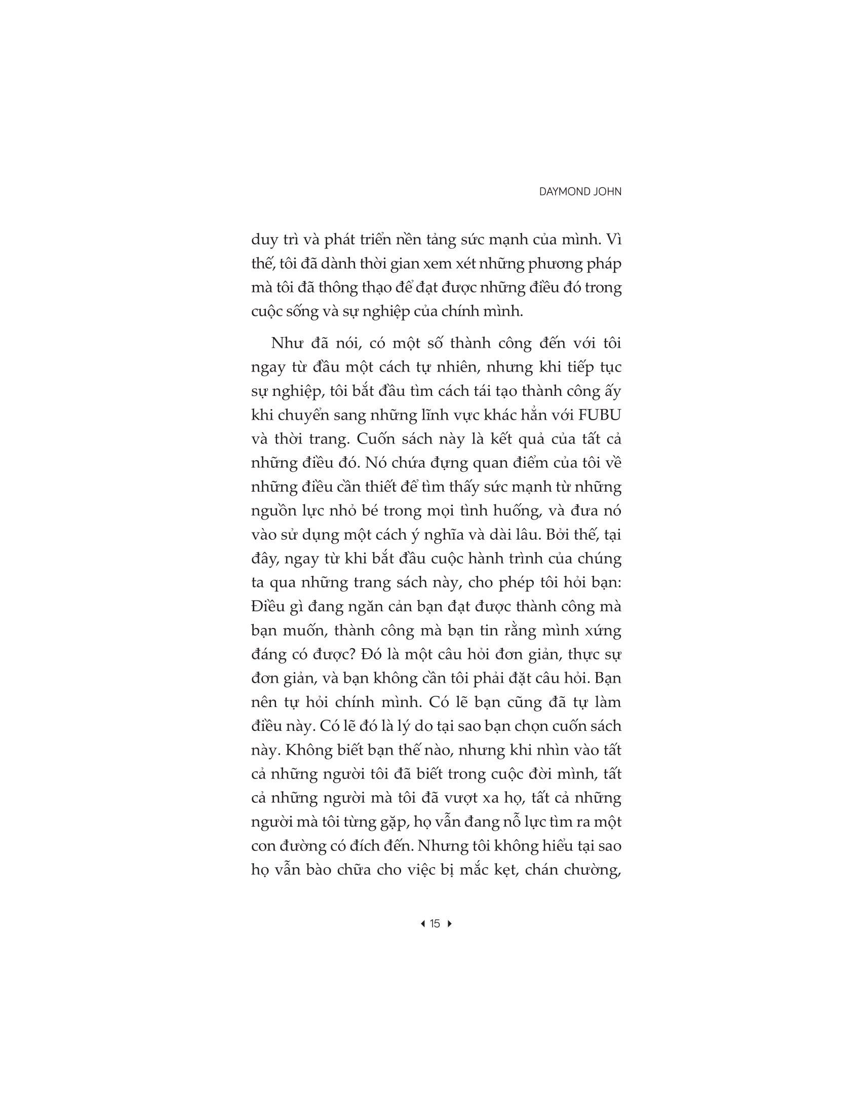 - TÁC GIẢ DAYMOND JOHN Trong 20 năm qua, Daymond John đã phát triển từ một trong những biểu tượng thời trang thành công nhất trong thế hệ của m.ình thành một trong những chuyên gia xây dựng thương hiệu, doanh nghiệp và diễn giả truyền động lực được săn đón nhiều nhất nước Mỹ. Thương hiệu FUBU (For Us By Us) của ông tiên phong tạo ra không gian thời trang đô thị và đặt nền móng cho các công ty khác cạnh tranh trong thị trường. Với việc thương hiệu này thâm nhập vào các thị trường phổ thông, FUBU đã ghi nhận doanh thu hàng năm là 350 triệu USD, đưa nó lên ngang hàng với các nhãn hiệu quần áo thể thao thiết kế như Donna Karan New York và Tommy Hilfiger. Năm 2009, Daymond John tham gia chương trình Shark Tank, trở thành đối tác với các doanh nhân, giúp biến ước mơ của họ thành hiện thực. Hàng triệu khán giả theo dõi chương trình ấn tượng với năng lực tiếp thị và hiểu biết sâu sắc về kinh doanh của Daymond John. Để ghi nhận những đóng góp của ông cho thời trang và bộ mặt của doanh nghiệp Mỹ, Daymond đã được vinh danh với một số giải thưởng danh giá nhất bao gồm: Nhà tiếp thị Brandweek của năm, Giải thưởng Tiếp thị Thời đại Quảng cáo 1000 cho Chiến dịch Quảng cáo Xuất sắc, Giải thưởng Crain's Business of New York Forty Under Forty Award và Giải thưởng Doanh nhân của năm tại New York của Ernst & Young.