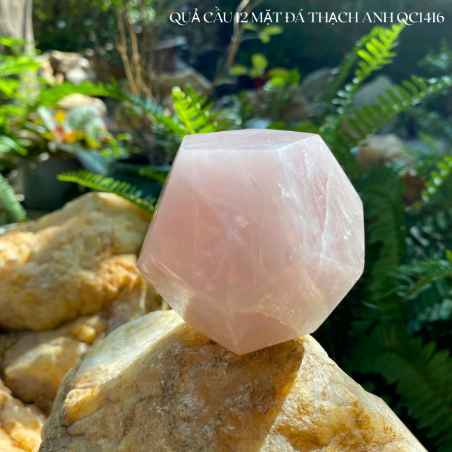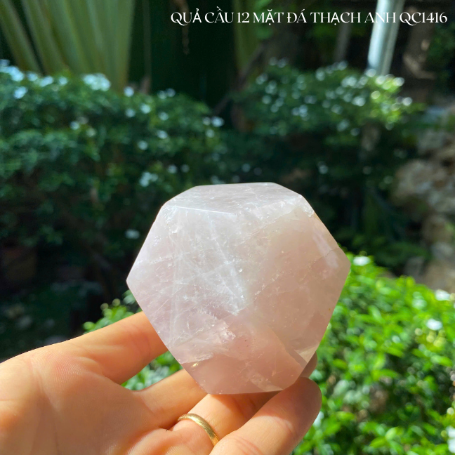 "Bỏ túi" năng lượng yêu thương và an lành với viên đá thạch anh hồng 12 mặt QC1409. Đường kính 8cm, nặng 520gr, chế tác tinh xảo. Biểu tượng của tình duyên, chữa lành và sự