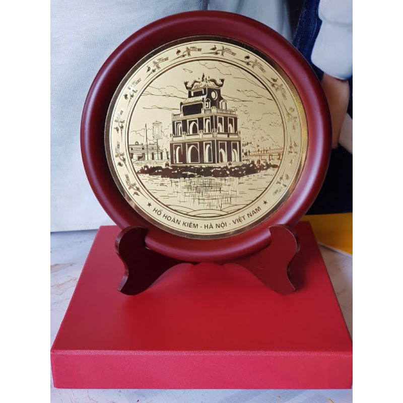 Sản phẩm tranh Tháp Rùa Hồ Gươm có chân để bàn phù hợp cho món quà tặng lưu niệm bền đẹp đầy ý nghĩa. Chất liệu được làm từ đồng vàng nguyên chất, viền khung