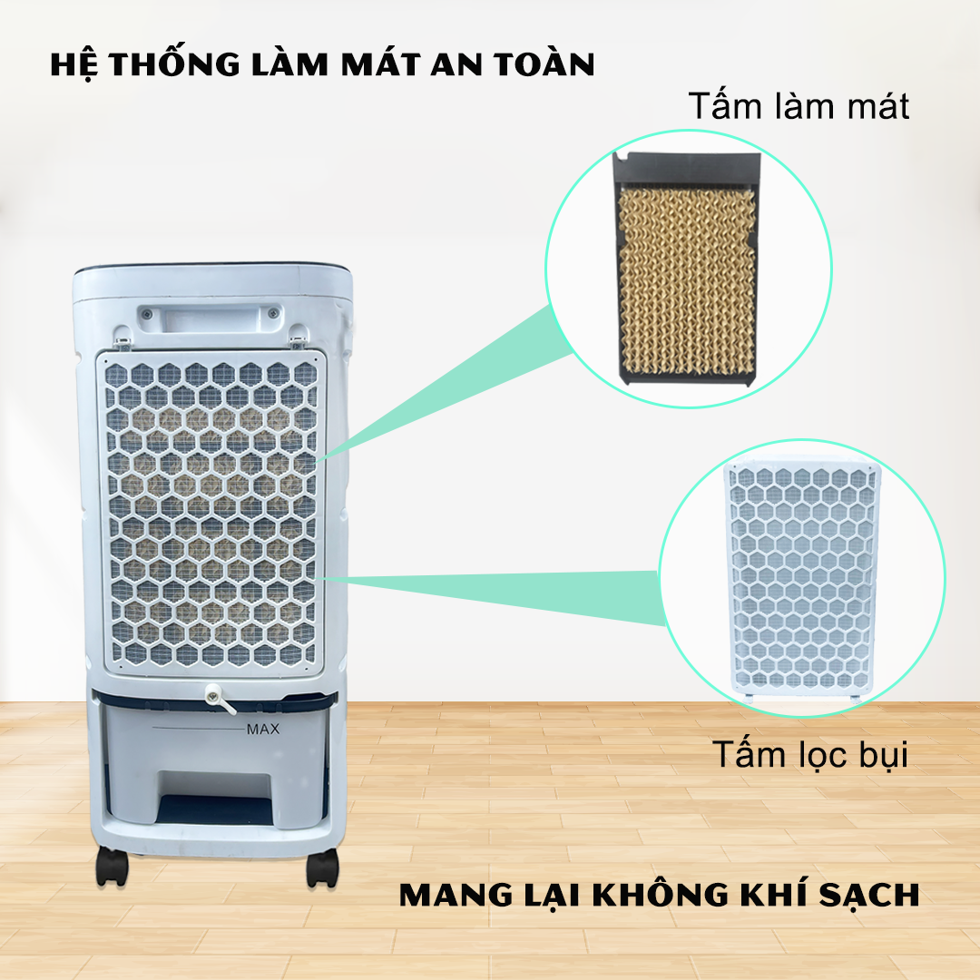 - Bạn cũng có thể dễ dàng vệ sinh bình nước của quạt làm mát do được thiết kế theo kiểu ngăn kéo, hạn chế nước bị rò rỉ khi làm vệ sinh. Độ ồn vận hành máy chỉ 56dB nên tương đối êm, không gây ra tiếng động khó chịu cho những phút giây nghỉ ngơi của bạn. Diện tích làm mát lên đến 20m2
