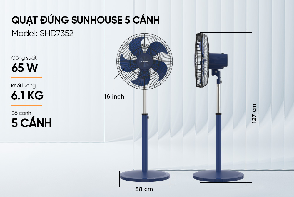 Sunhouse SHD7352 bao gồm 5 cánh quạt, đường kính sải cánh lên đến 40cm giúp đón gió hiệu quả, và tạo ra luồng không khí mát đều đặn, tỏa khắp không gian một cách đồng đều.