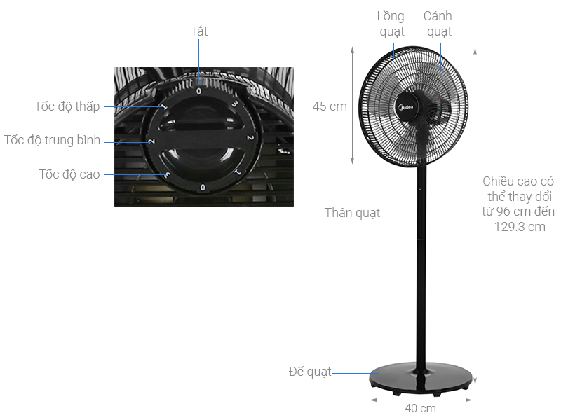 QUẠT ĐỨNG với chân đế cứng cáp, thay đổi chiều cao linh hoạt