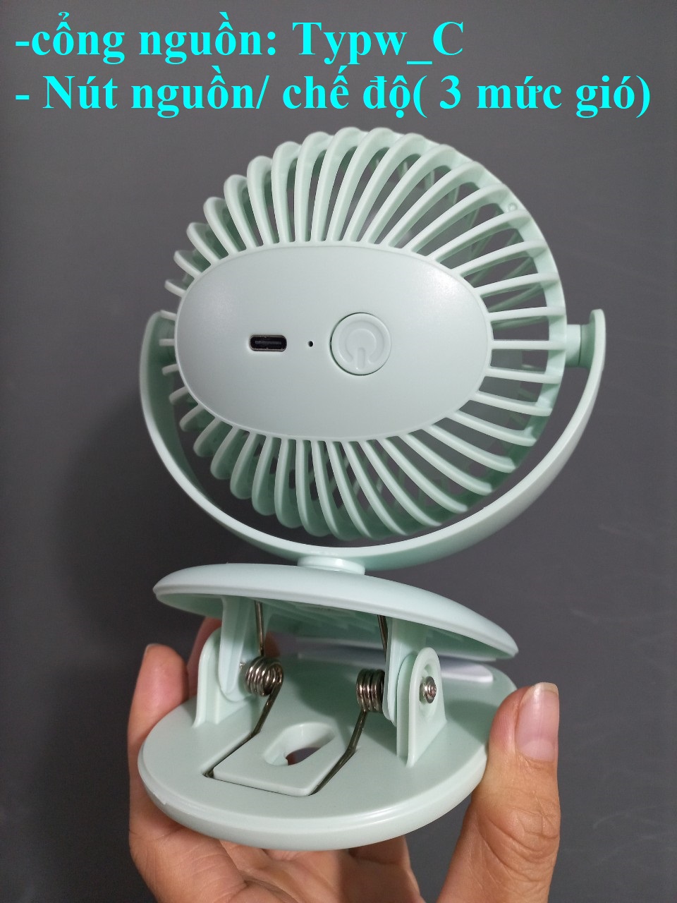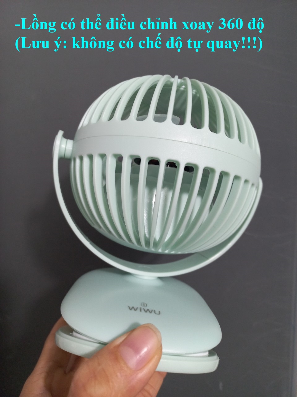 Mua tại TiktokQuạt sạc mini thương hiệu Wiwu -Model: FS-03 -Xuất xứ: Trung Quốc Mô tả: -Công suất 3W -3 mức gió -Lồng điều chỉnh xoay 360 độ ( Lưu ý: không có chế độ tự quay!) -Khung bán nguyệt giữ lồng điều chỉnh xoay 360 độ quanh đế kẹp -Đế kẹp dành cho mặt phẳng dày dưới 4.5cmn -Cổng sạc type_C, kèm 1 cáp usb-C -Dùng liên tiếp 2-4 giờ tùy mức độ gió -Chất liệu: Nhựa -Kích thước; 123 127 160mm -Khối lượng ~200gr