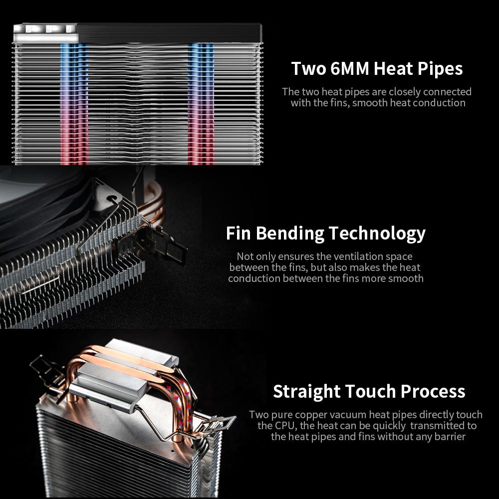 Features: Two pure copper vacuum heat pipes are closely connected with the fins and directly touch the CPU, the heat can be quickly transmitted to the heat pipes and fins without any barrier. The fin