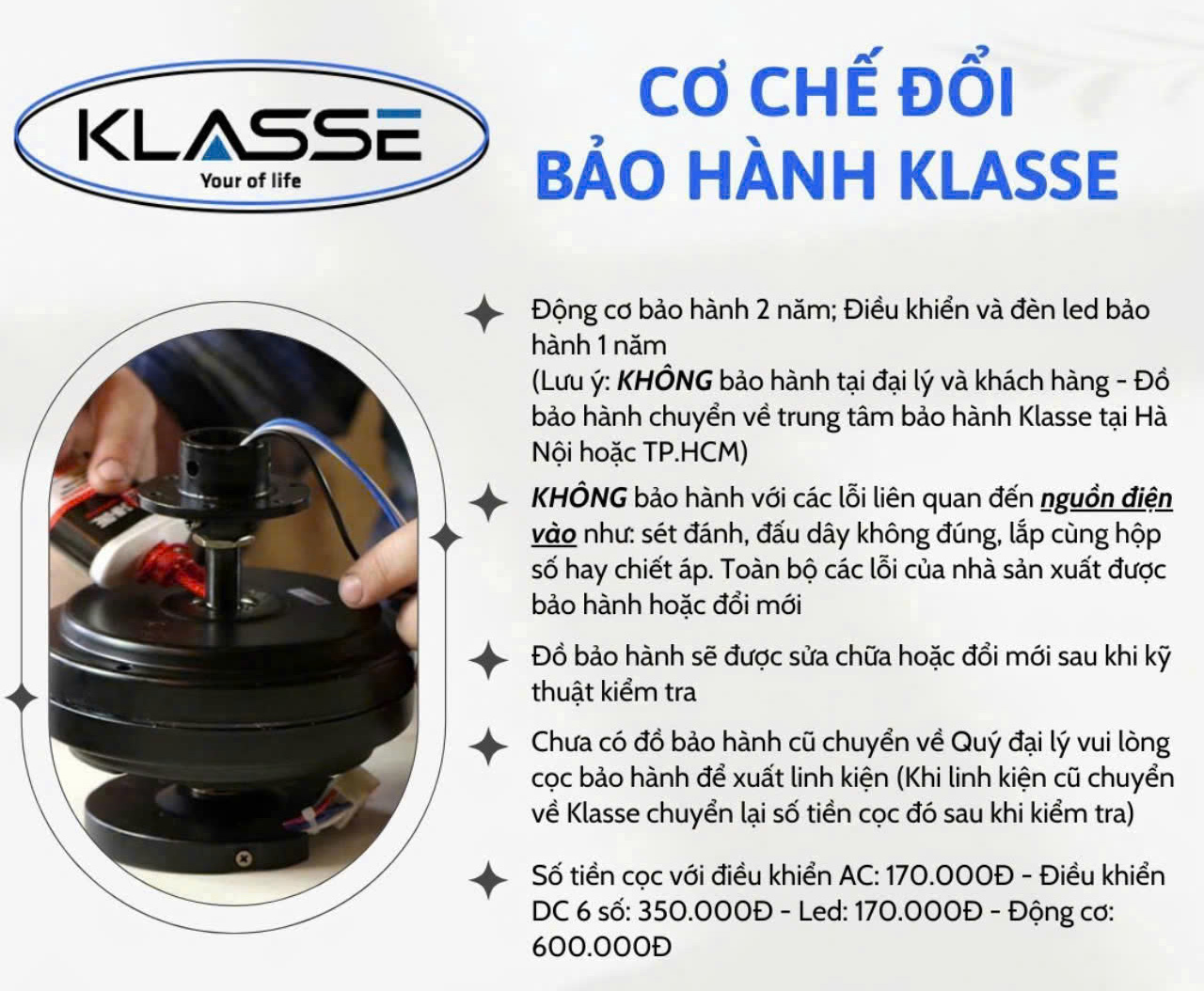 Chúng tôi cam kết bảo vệ quyền lợi của khách hàng thông qua chính sách bảo hành đáng tin cậy. Động cơ của sản phẩm được bảo hành trong 2 năm, đèn led và điều