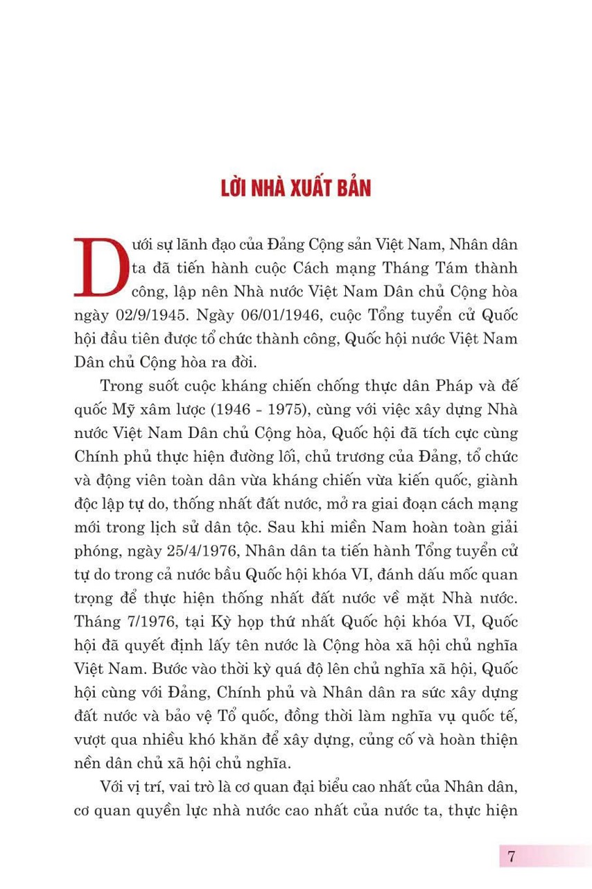 Cuốn sách tuyển chọn 95 bài viết, bài phát biểu và trả lời phỏng vấn của đồng chí Tổng Bí thư Nguyễn Phú Trọng về xây dựng, hoàn thiện Nhà nước pháp quyền xã hội chủ nghĩa Việt Nam và Quốc hội Việt Nam; tuyển chọn hơn 100 bức ảnh tư liệu quý và 57 ý kiến tiêu biểu của các đồng chí nguyên lãnh đạo Đảng, Nhà nước, đại biểu Quốc hội, Nhân dân và bạn bè quốc tế. Các bài viết, bài phát biểu trong cuốn sách thể hiện tư duy nhất quán và sự lãnh đạo toàn diện của đồng chí Tổng Bí thư đối với vấn đề đổi mới tổ chức, nâng cao hiệu lực, hiệu quả hoạt động của Quốc hội và xây dựng, hoàn thiện Nhà nước pháp quyền xã hội chủ nghĩa Việt Nam trong giai đoạn hiện nay.