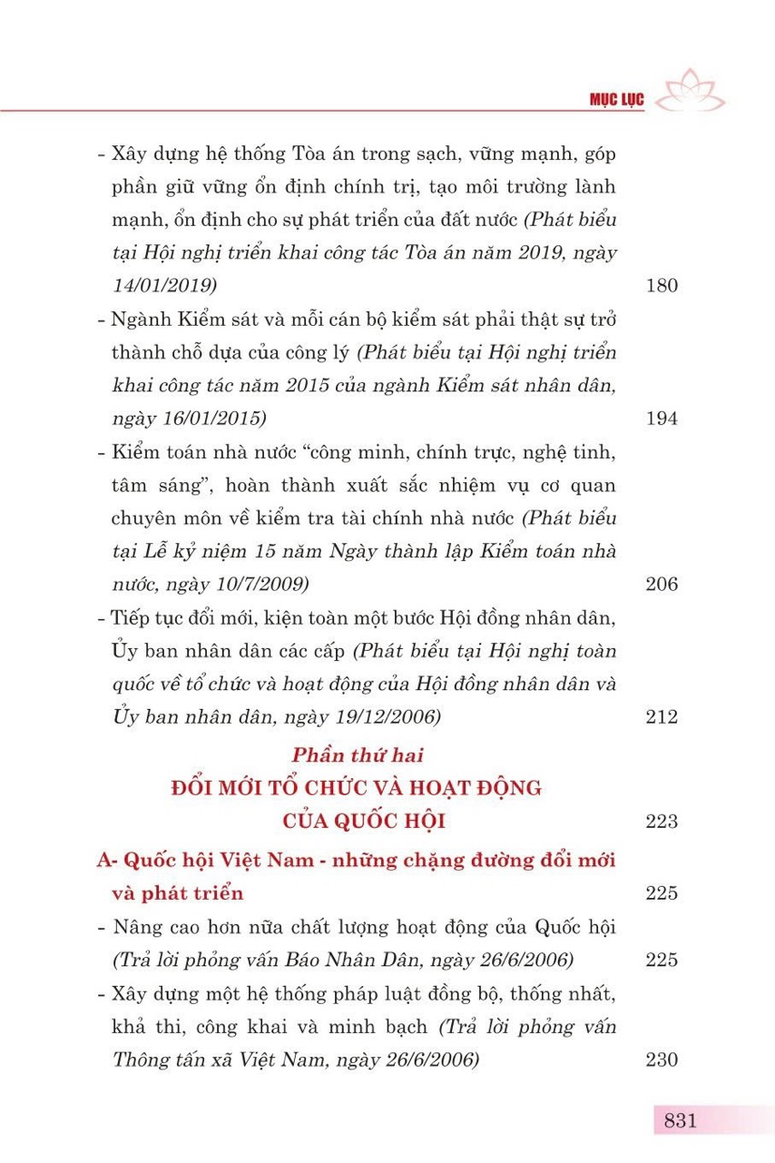 Phần thứ nhất: Xây dựng và hoàn thiện Nhà nước pháp quyền xã hội chủ nghĩa Việt Nam, gồm 15 bài viết, bài phát biểu, trả lời phỏng vấn của đồng chí Tổng Bí thư Nguyễn Phú Trọng về các vấn đề: chủ nghĩa xã hội và con đường đi lên chủ nghĩa xã hội; xây dựng, hoàn thiện Nhà nước pháp quyền xã hội chủ nghĩa và các thiết chế trong Nhà nước pháp quyền xã hội chủ nghĩa Việt Nam.