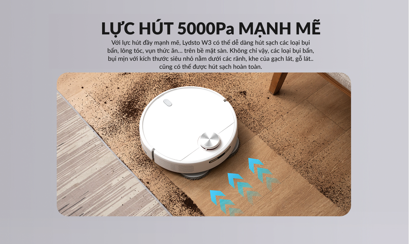 CÔNG SUẤT HÚT MẠNH MẼ chế độ lau chế độ hút 4000PA Hút sạch và cực sâu, loại bỏ hoàn toàn bụi và rác mang lại bầu không khí trong lành lý tưởng.