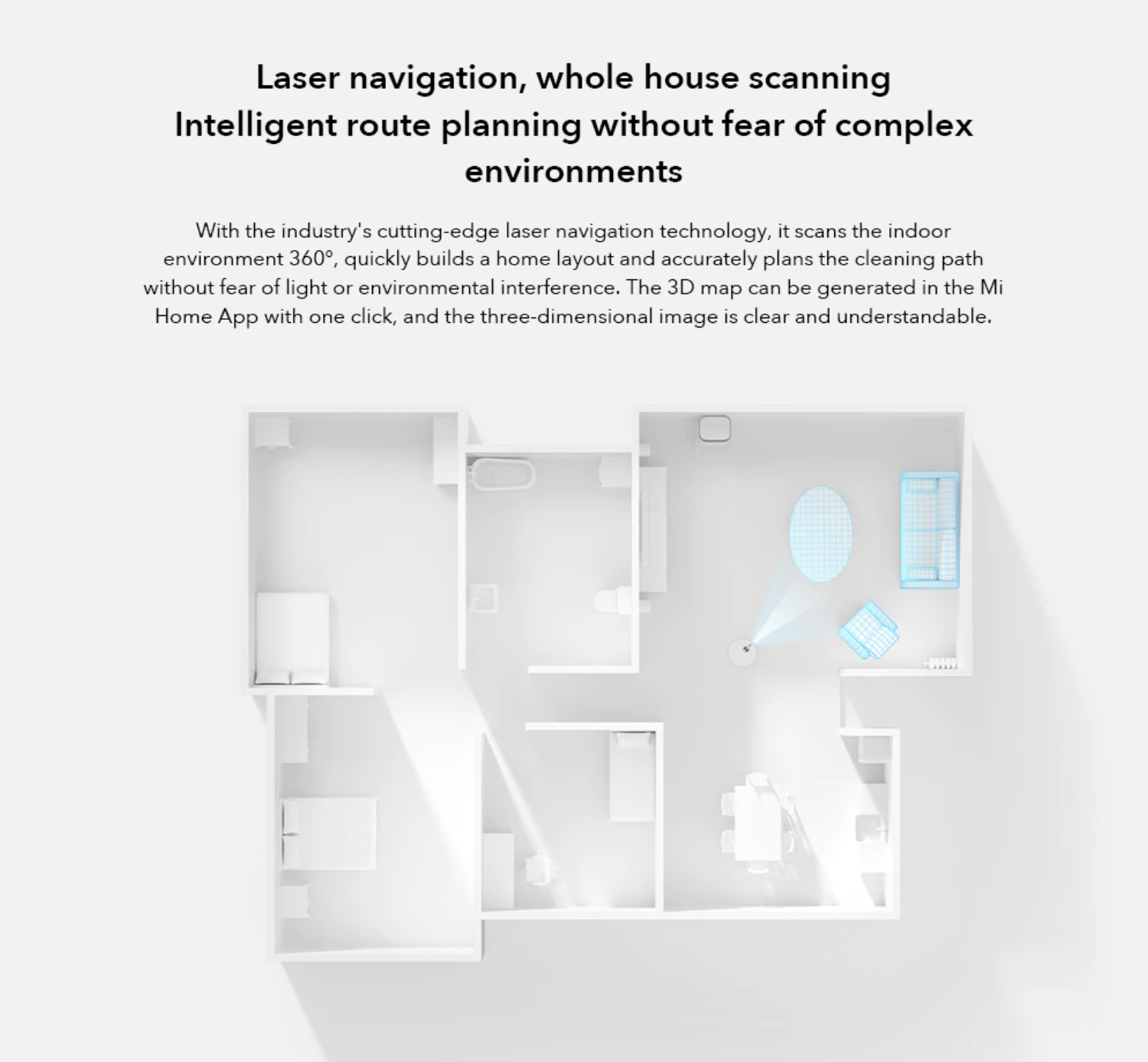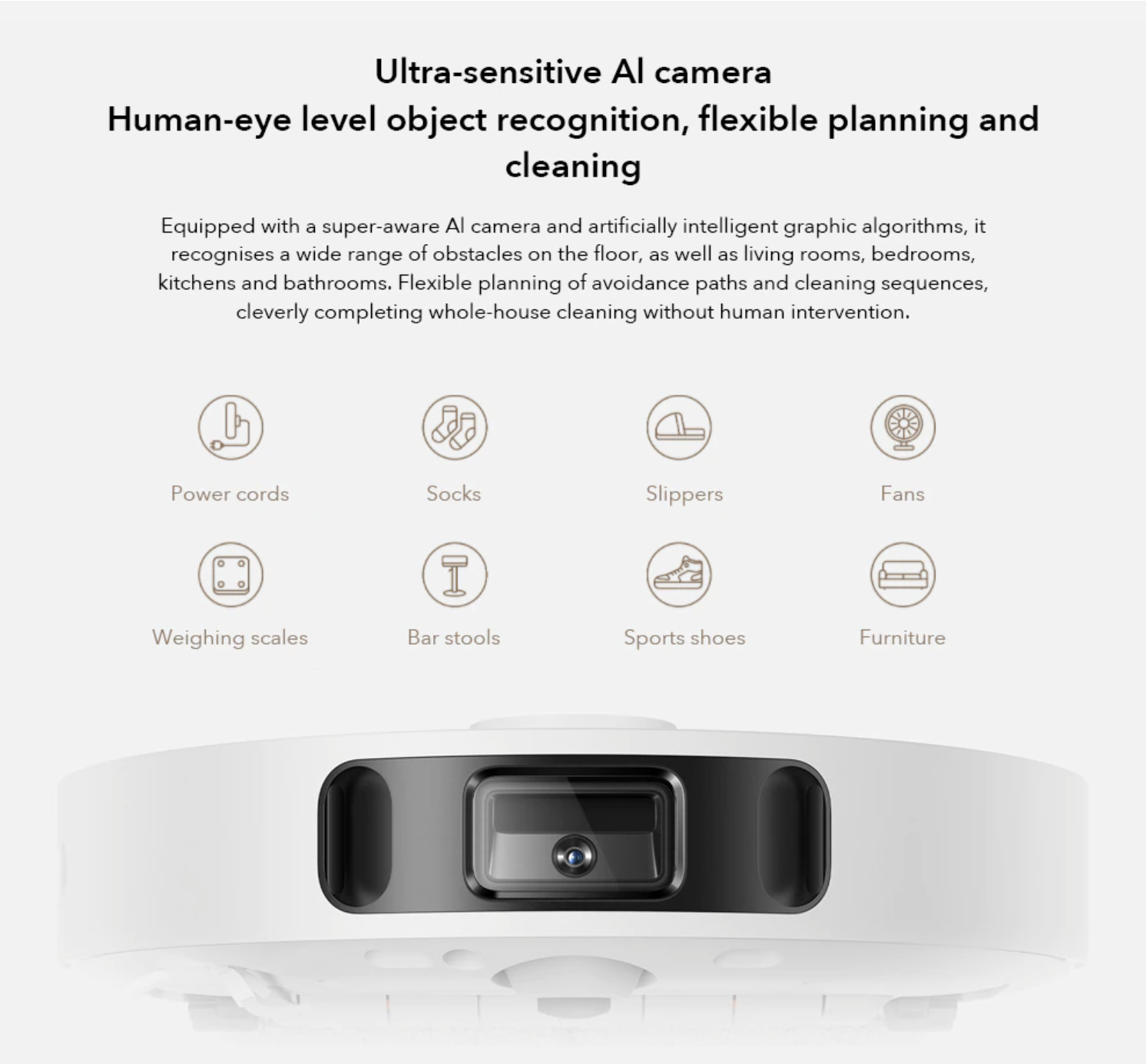 Mijia Omni được trang bị camera AI siêu cảm biến và thuật toán đồ họa trí tuệ nhân tạo, nó có thể đánh giá độc lập loại phòng dựa trên nhận dạng đồ nội thất. Đồng thời, với ứng dụng Mijia, người dùng cũng có thể cài đặt dọn dẹp từng phòng tùy chỉnh, phù hợp với từng nhu cầu sử dụng của chủ nhà.