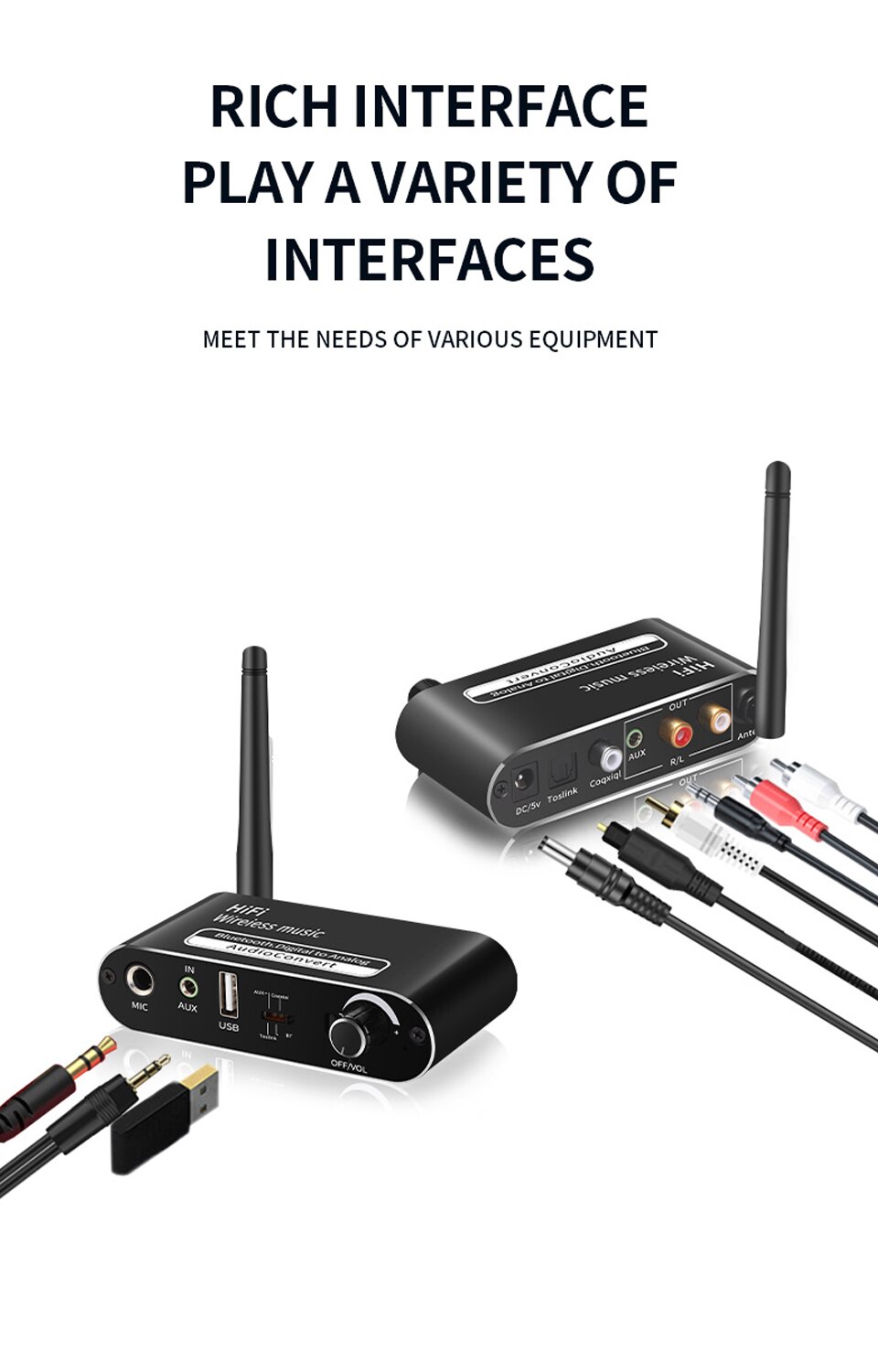 Tính năng: Bộ thu âm thanh tương thích với Bluetooth, bộ chuyển đổi âm thanh kỹ thuật số sang tương tự, bộ điều hợp phát lại đĩa flash USB. Có dây thành không dây, biến