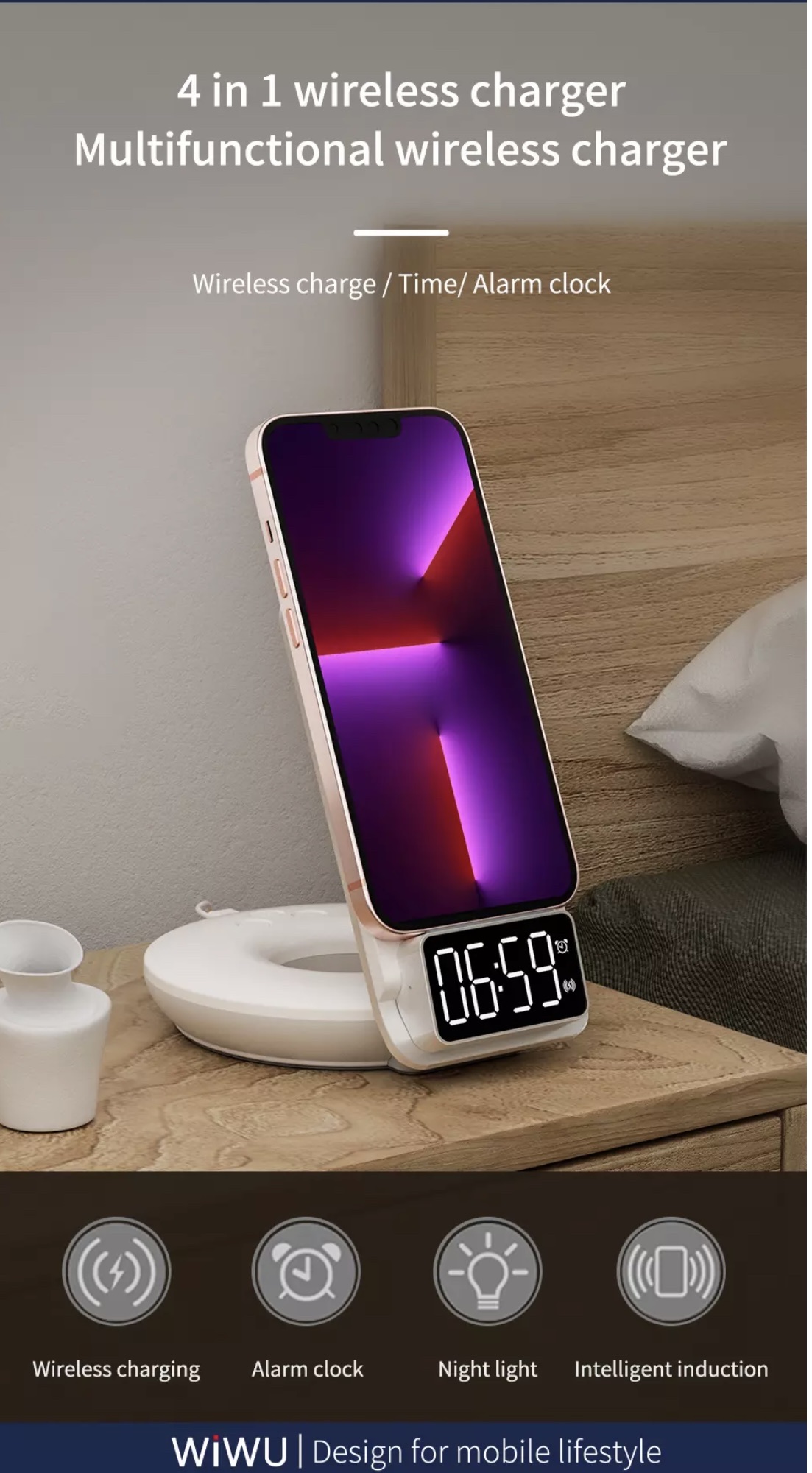 ✨Sạc Wiwu Automatic Positioning 4in1 M11 Dành Cho Điện Thoại Hỗ Trợ Sạc Nhanh Không Dây, Có Đồng Hồ Báo Thức - Hàng Chính Hãng
