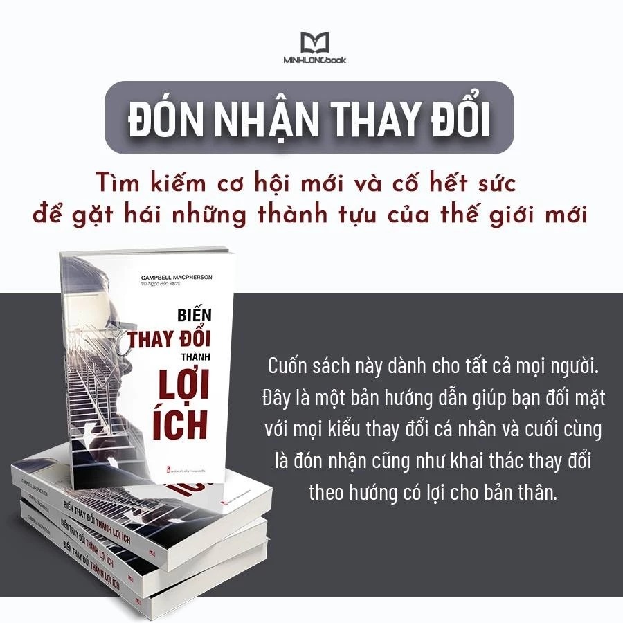 Sách: Biến Thay Đổi Thành Lợi Ích  Lẽ ra Forrest Gump nên nói: “Thay đổi luôn xảy ra.” Những ai có thể đương đầu với thay đổi sẽ tồn tại. Những ai có thể đón nhận những thay đổi và tìm ra những cơ hội sẽ phát triển mạnh mẽ. Và sức mạnh để thay đổi nằm trong mỗi chúng ta.    Những sự thay đổi chóng mặt trong thời đại “Bình thường mới”  Đại dịch đã tàn phá các nền kinh tế của chúng ta, đẩy vô số doanh nghiệp đến bờ vực phá sản và còn hơn thế nữa. Nhiều người vị mất việc hoặc thu nhập. Tin tốt là mọi việc vẫn được tiếp tục vận hành bởi chúng ta nhanh chóng mò mẫn, rèn luyện được cách làm việc hành mới. Đại dịch này cũng có thể đem đến cho chúng ra một món quà nếu chúng ta muốn đón nhận. Nó cho chúng ta một cơ hội có một không hai để suy ngẫm xem điều gì là quan trọng, xem điều gì cần thay đổi.  Và rồi chúng ta có thể thay đổi.  Thay đổi rất khó khăn. Hầu hết chúng ta đều thấy hoàn toàn bất lực khi đối mặt với thay đổi nhất là những thay đổi lớn ảnh hưởng đến bản thân như mất việc, li hôn hay mất người thân  Cuốn sách này được thiết kế để giúp chúng ta làm chính xác việc đó. Chúng ta có sức mạnh để tạm ngừng, suy ngẫm, đánh giá lại những ưu tiên của mình và các định những điều thực sự quan trọng trong cuộc sống. Cuốn sách này dành cho tất cả mọi người. Đây là một bản hướng dẫn giúp bạn đối mặt với mọi kiểu thay đổi cá nhân và cuối cùng là đón nhận cũng như khai thác thay đổi theo hướng có lợi cho bản thân.   Nhưng chúng ta không hề bất lực. Chúng ta có thể học cách xoay chuyển tình huống theo hướng có lợi cho mình. Tất cả chúng đều có sức mạnh để đón nhận thay đổi và tìm kiếm cơ hội - Chỉ cần học cách khai thác sức mạnh ấy mà thôi !