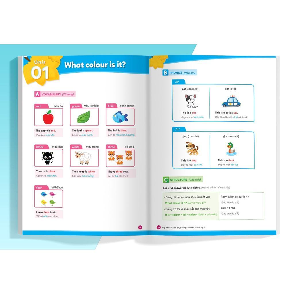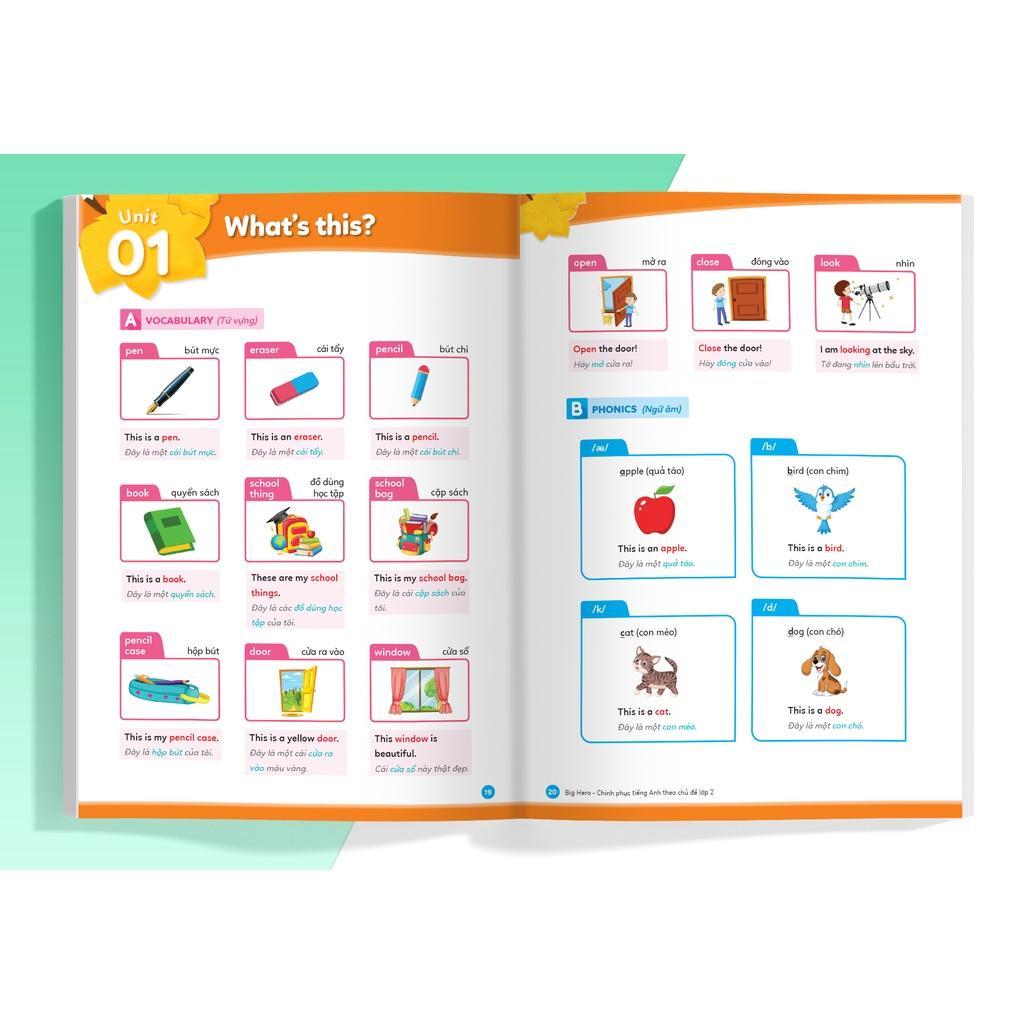 - Big Hero Chinh phục tiếng Anh theo chủ đề lớp 2 Bộ sách BIG HERO – Chinh phục tiếng anh theo chủ đề lớp 1 2, là 1 trong 5 cuốn nằm trong bộ BIG HERO – Chinh phục tiếng anh theo chủ đề, dành riêng cho các bạn học sinh tiểu học từ lớp 1 đến lớp 5. Bộ sách là tài liệu tham khảo đầy đủ, toàn diện, với phần lý thuyết và bài tập của đủ các mảng kiến thức: từ vựng, ngữ âm, ngữ pháp. Mỗi cuốn gồm 9 đến 12 chủ đề thân thuộc với các em. Lồng ghép trong mỗi chủ đề chính là các kiến thức và bài tập tiếng Anh, mỗi bài học gồm các phần: VOCABULARY (Từ vựng) PHONICS (Ngữ âm) STRUCTURE (Cấu trúc) PHONICS EXERCISE (Bài tập ngữ âm) VOCABULARY EXERCISE (Bài tập từ vựng) STRUCTURE EXERCISE (Bài tập cấu trúc) ANSWER KEY (Đáp án chi tiết) Cuốn sách được thiết kế với nội dung và hình ảnh sinh động, cấu trúc chặt chẽ, rõ ràng. Chắc chắn đây sẽ là một bộ tài liệu vô cùng hữu ích dành cho các em trên con đường học tiếng Anh.